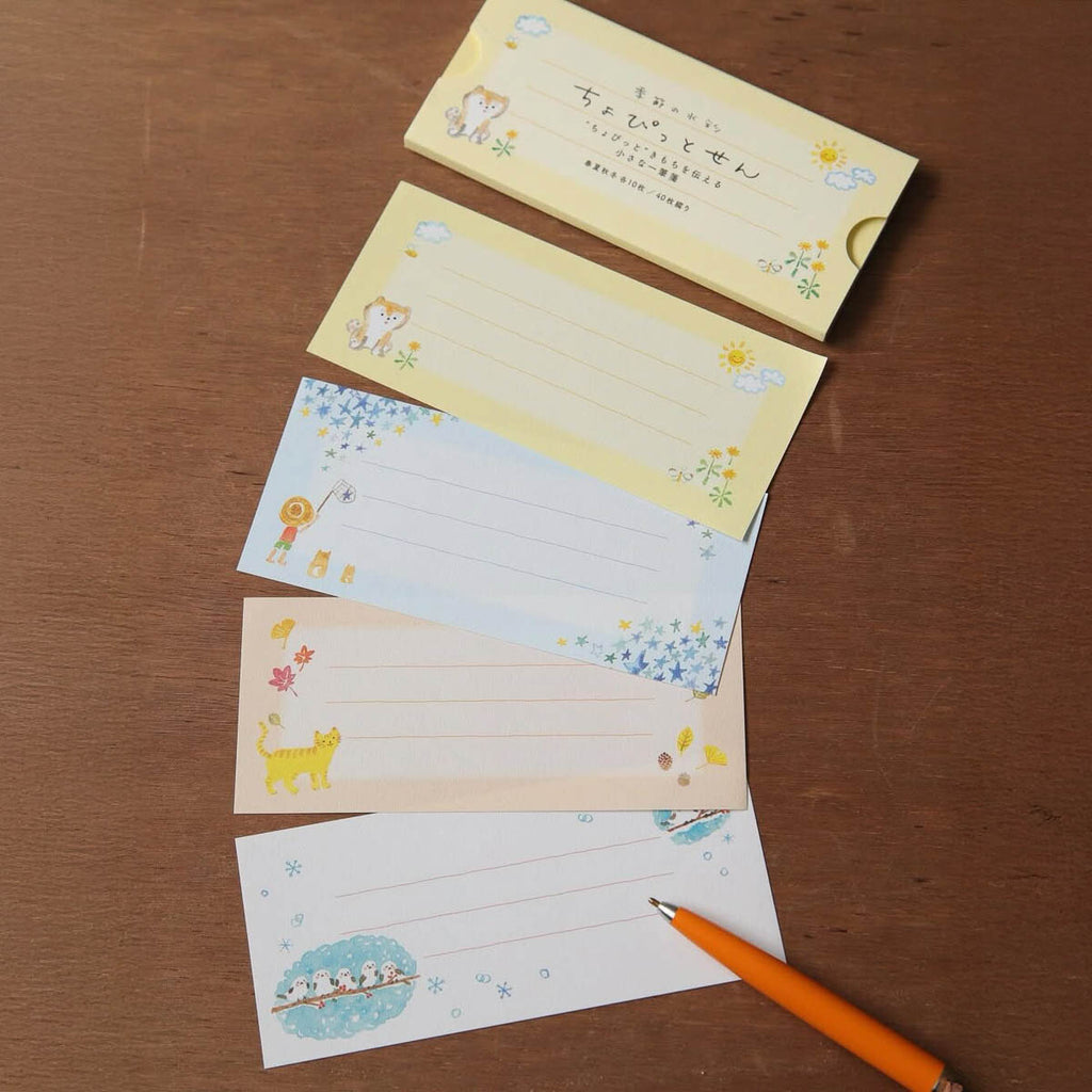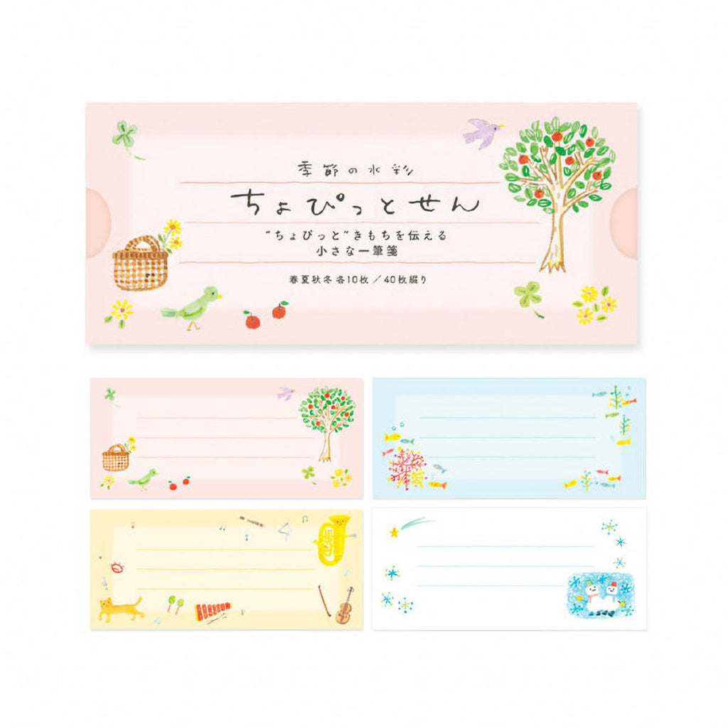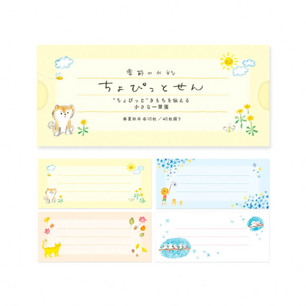 Die kleine Einlegekarte eignet sich ideal für kurze Nachrichten oder Dankesworte. Vier liebevoll in Aquarell gestaltete Motive zeigen Szenen aus den Jahreszeiten – darunter ein Shiba-Inu mit Löwenzahn, eine Sommernacht, herbstliche Blätter und einen Wintervogel. Die 40 Blätter sind in einer handlichen Schutzhülle mit Fingeraussparungen aufbewahrt und lassen sich leicht entnehmen.