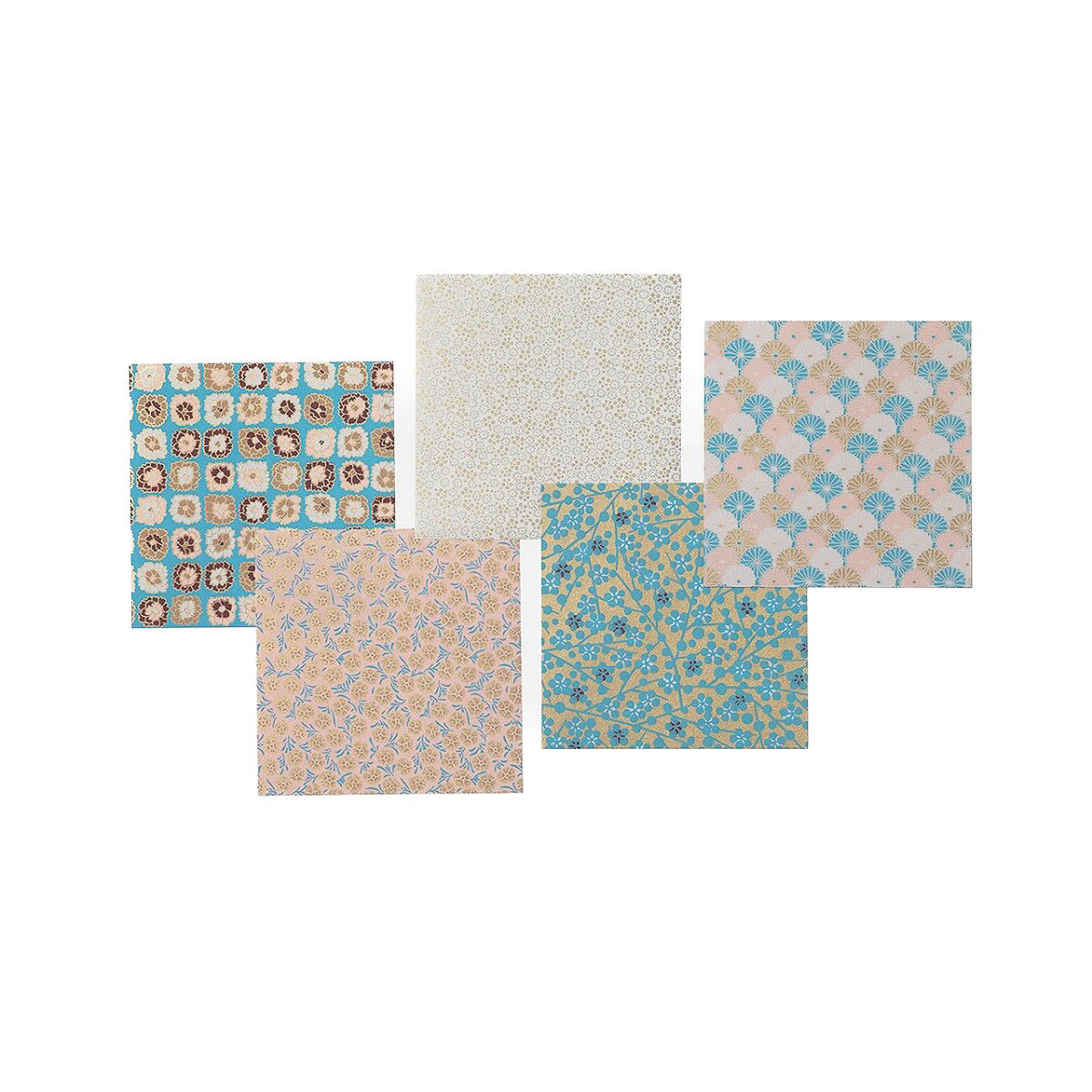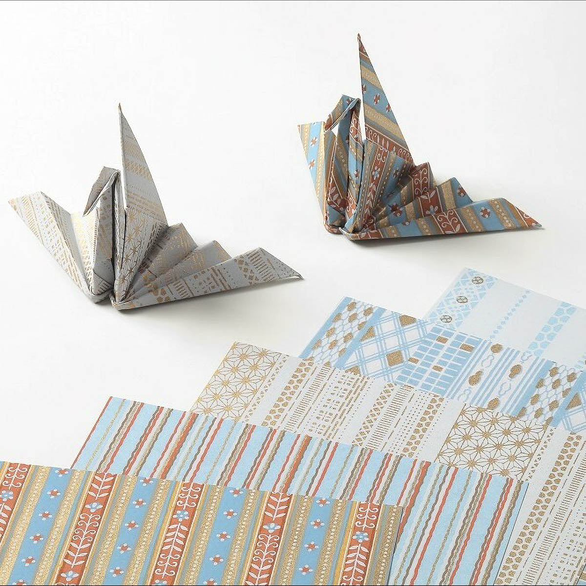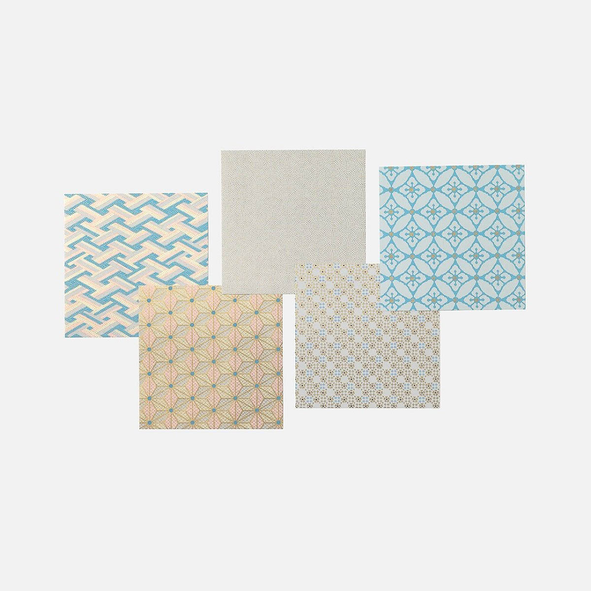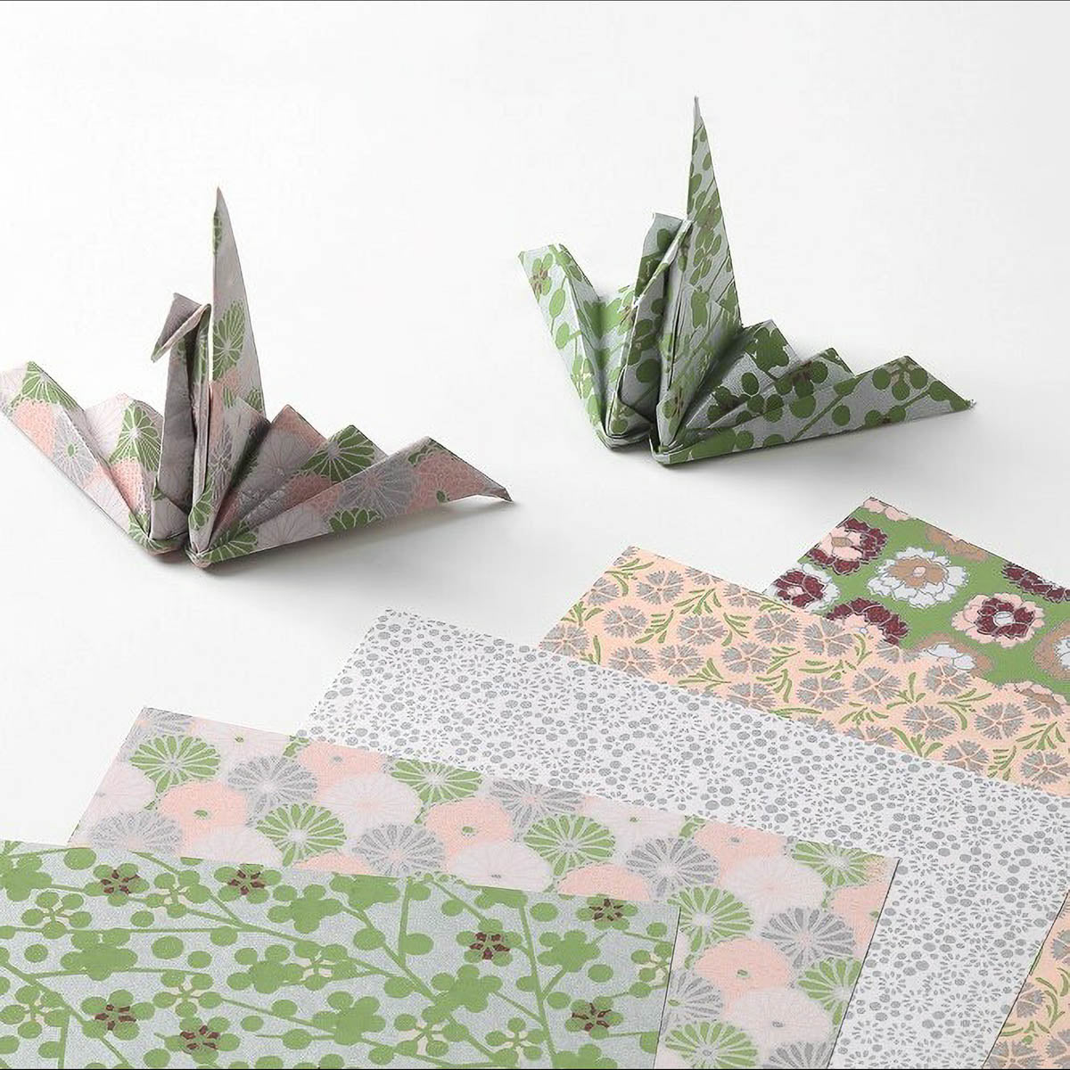 Die Origami-Sets zeigen fünf traditionelle japanische Muster, die im Handdruckverfahren auf Yuzen-Washi aufgebracht sind. Die handgefärbten Gold- und Silberakzente sowie die sanften Farbtöne verleihen dem Papier eine ruhige, frische Ausstrahlung und eignen sich gut für dekorative Faltarbeiten.