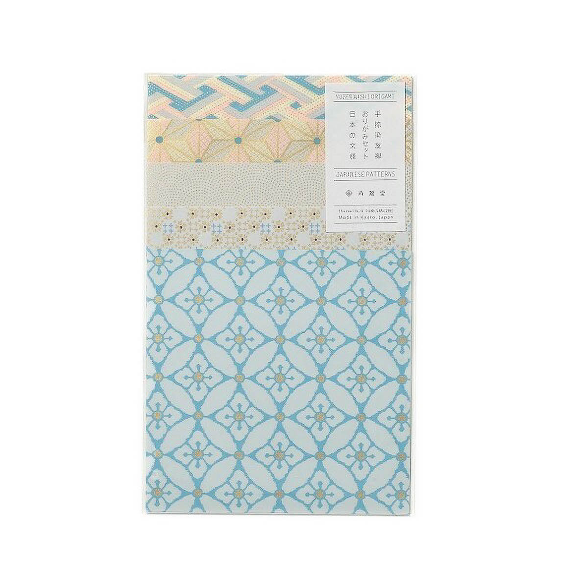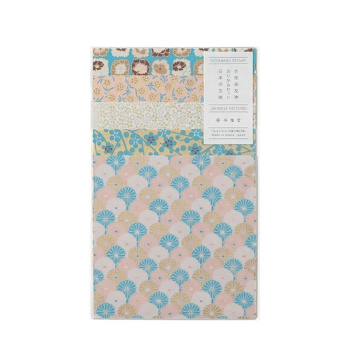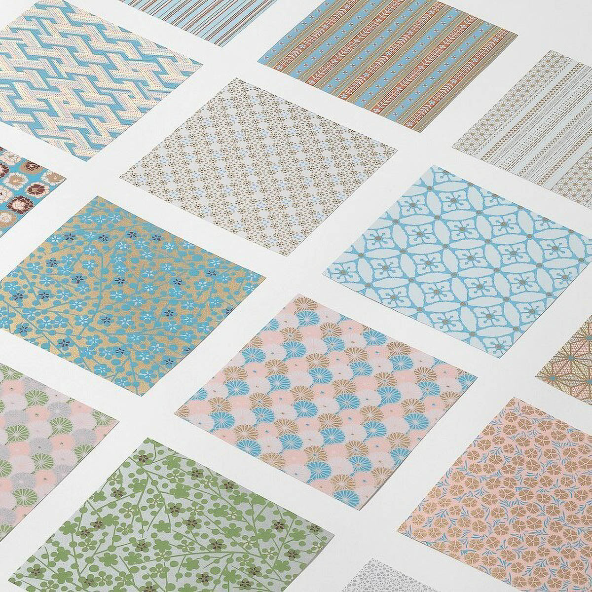 Die Origami-Sets zeigen fünf traditionelle japanische Muster, die im Handdruckverfahren auf Yuzen-Washi aufgebracht sind. Die handgefärbten Gold- und Silberakzente sowie die sanften Farbtöne verleihen dem Papier eine ruhige, frische Ausstrahlung und eignen sich gut für dekorative Faltarbeiten.