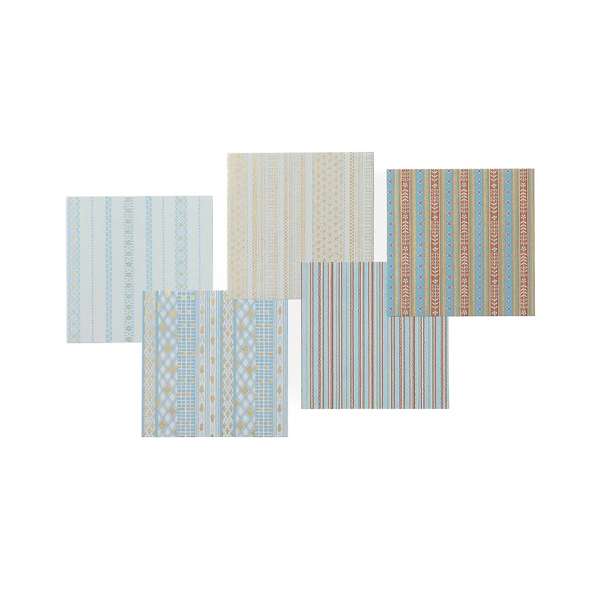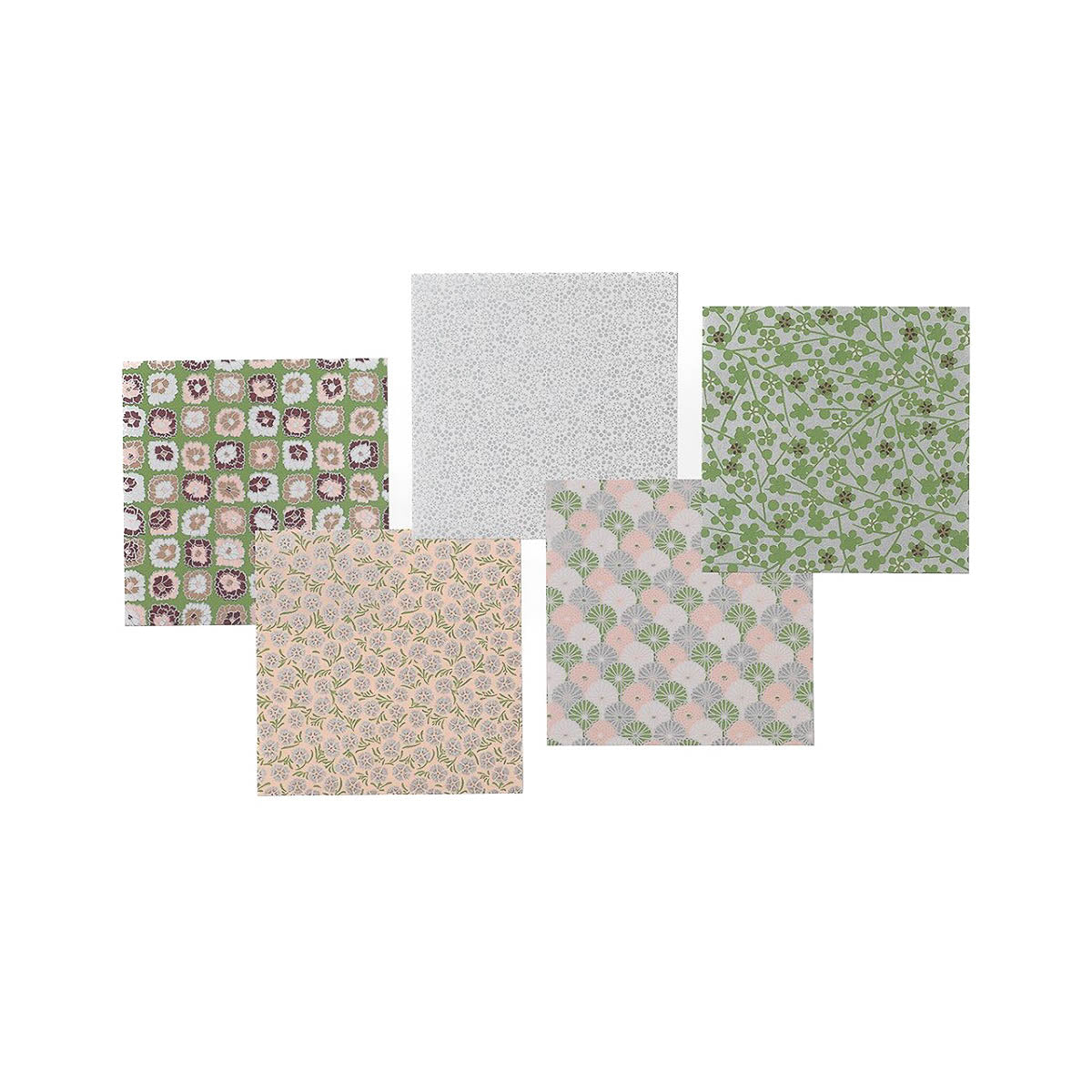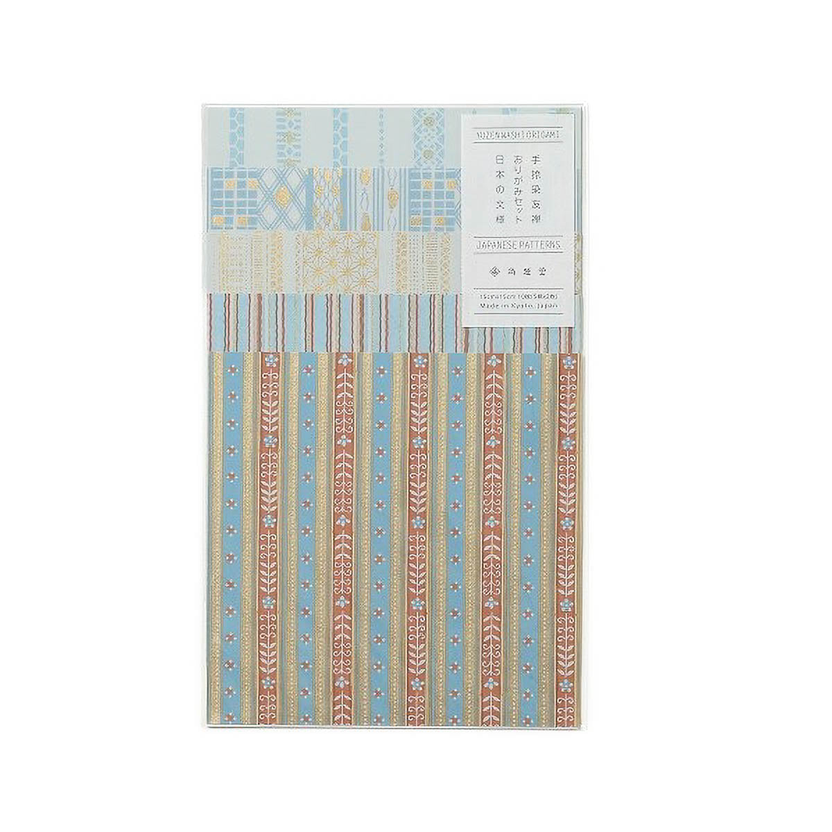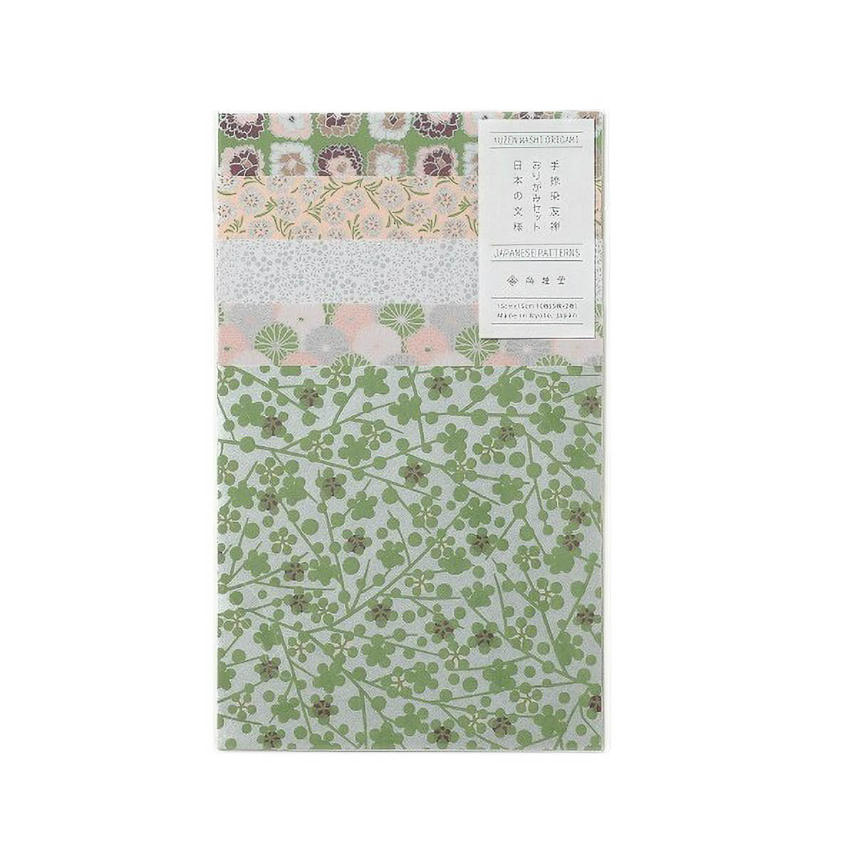 Die Origami-Sets zeigen fünf traditionelle japanische Muster, die im Handdruckverfahren auf Yuzen-Washi aufgebracht sind. Die handgefärbten Gold- und Silberakzente sowie die sanften Farbtöne verleihen dem Papier eine ruhige, frische Ausstrahlung und eignen sich gut für dekorative Faltarbeiten.