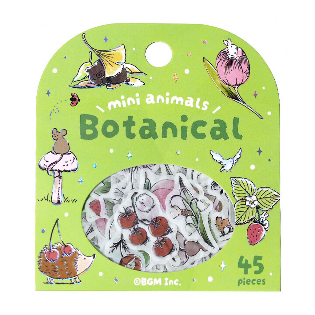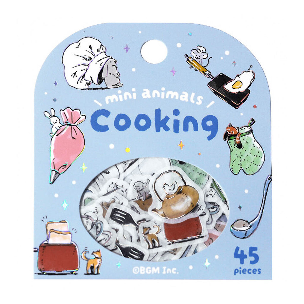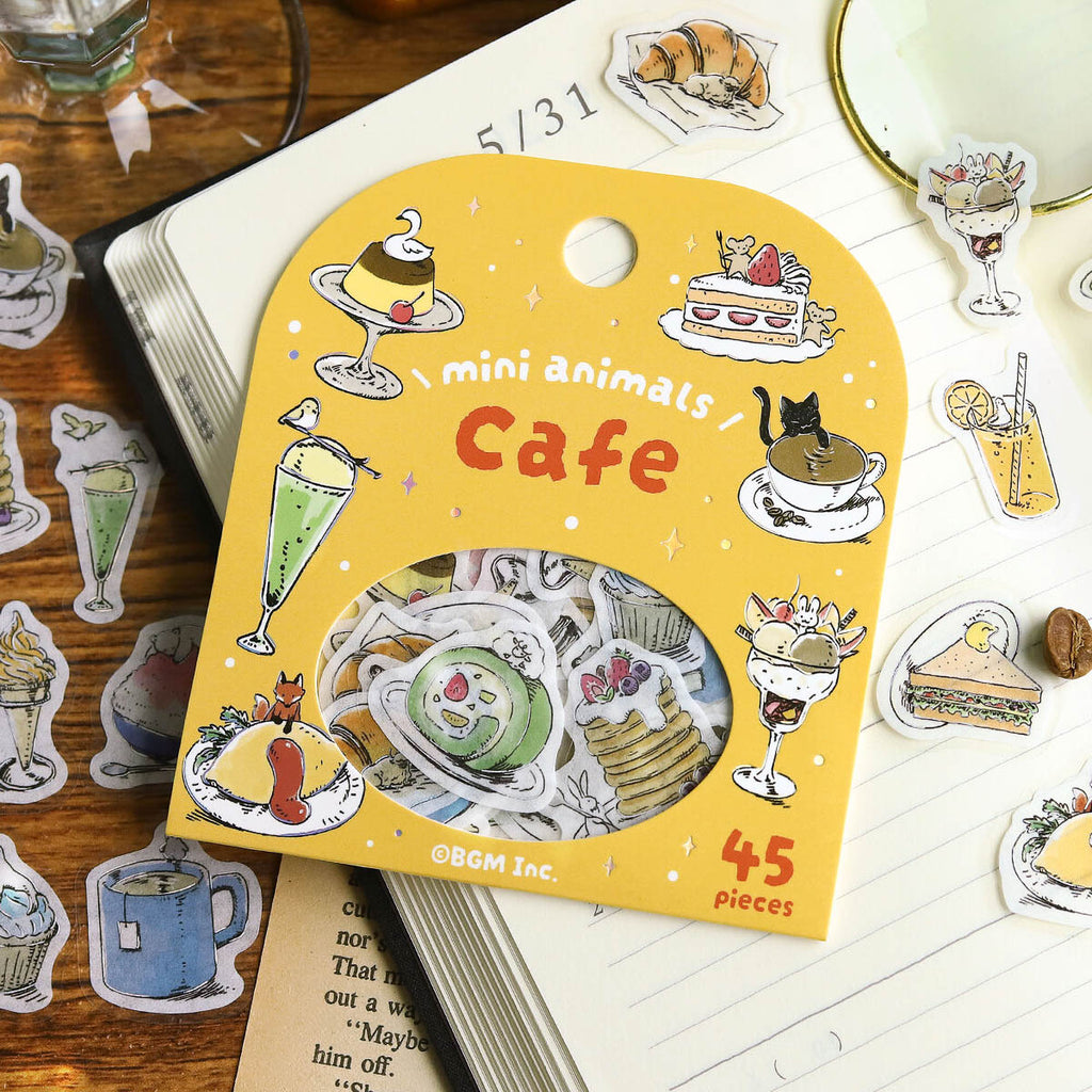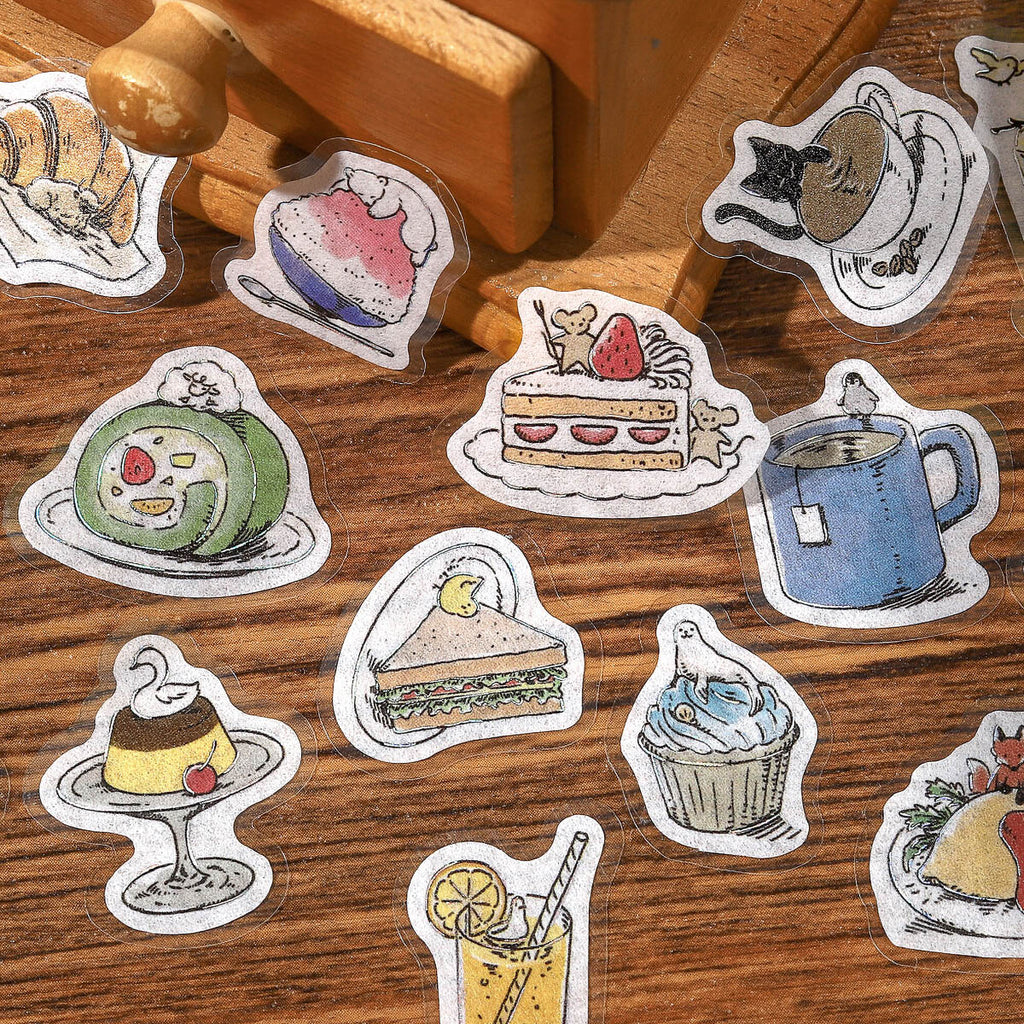 Flake-Sticker-Set aus Washi-Papier mit Motiven rund um Café, Pflanzen, Schreibwaren und Kochen. Zwischen den Designs tauchen kleine Tiere auf und sorgen für einen besonders niedlichen Akzent.