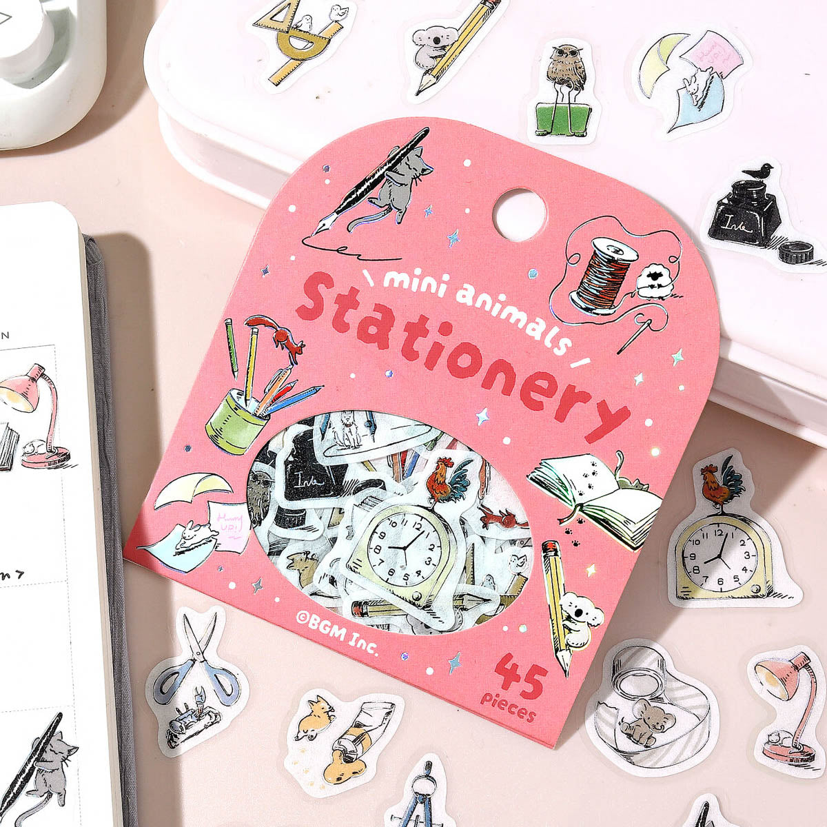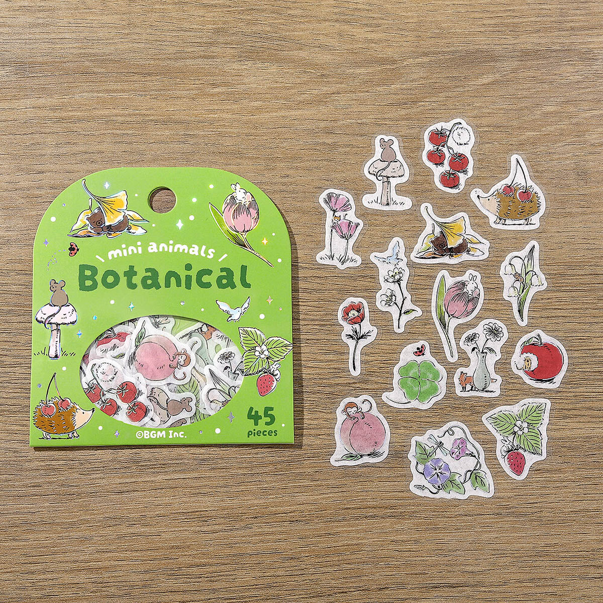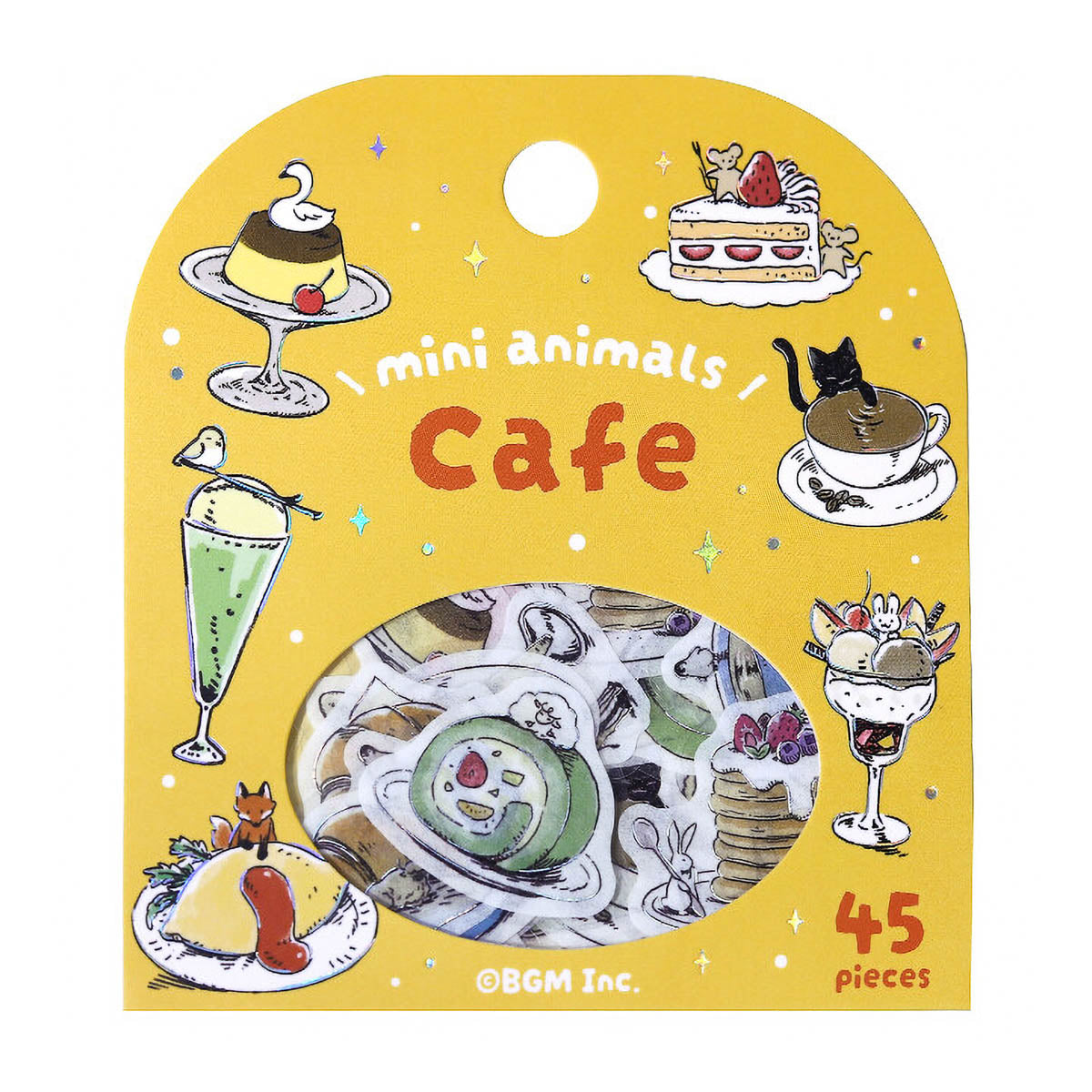 Flake-Sticker-Set aus Washi-Papier mit Motiven rund um Café, Pflanzen, Schreibwaren und Kochen. Zwischen den Designs tauchen kleine Tiere auf und sorgen für einen besonders niedlichen Akzent.