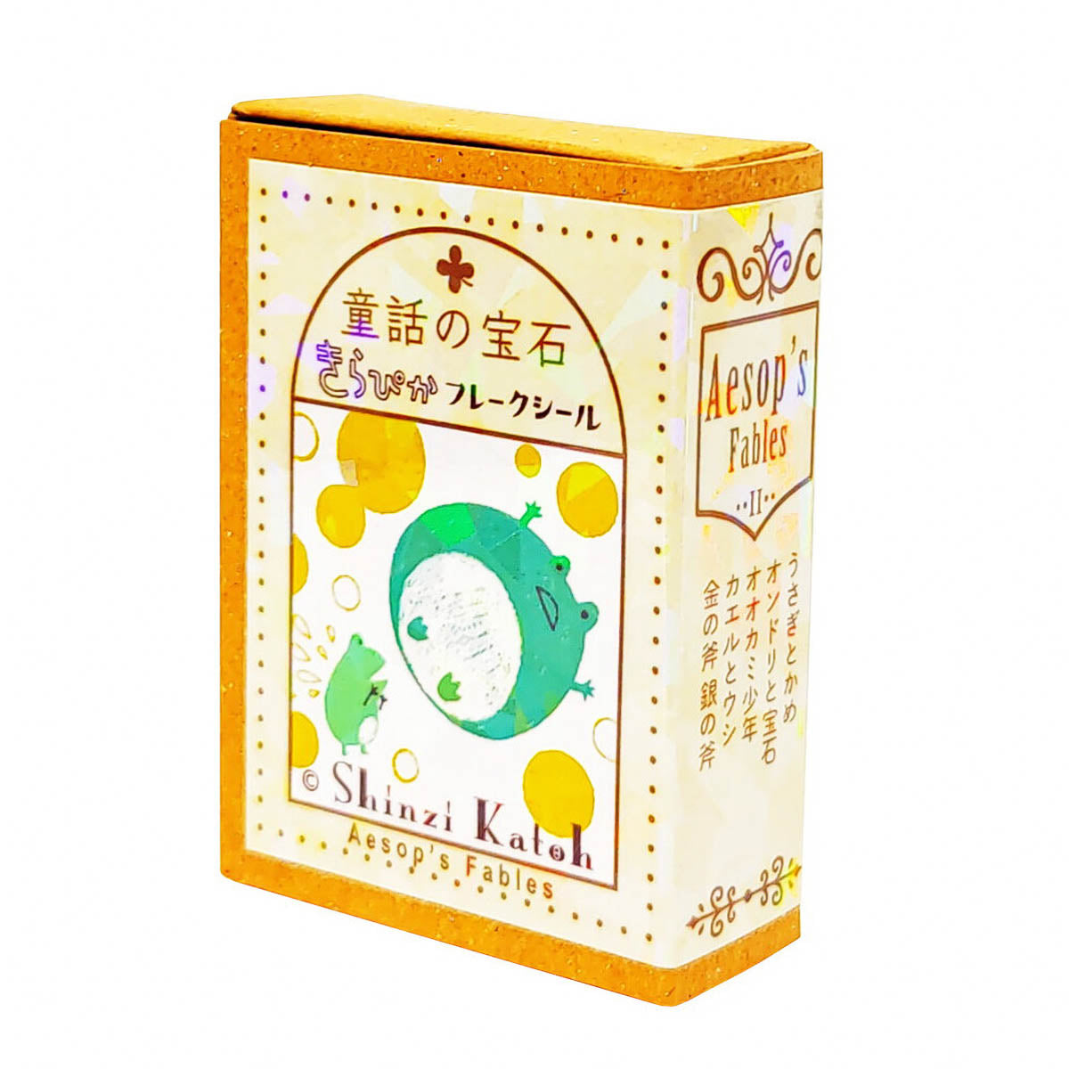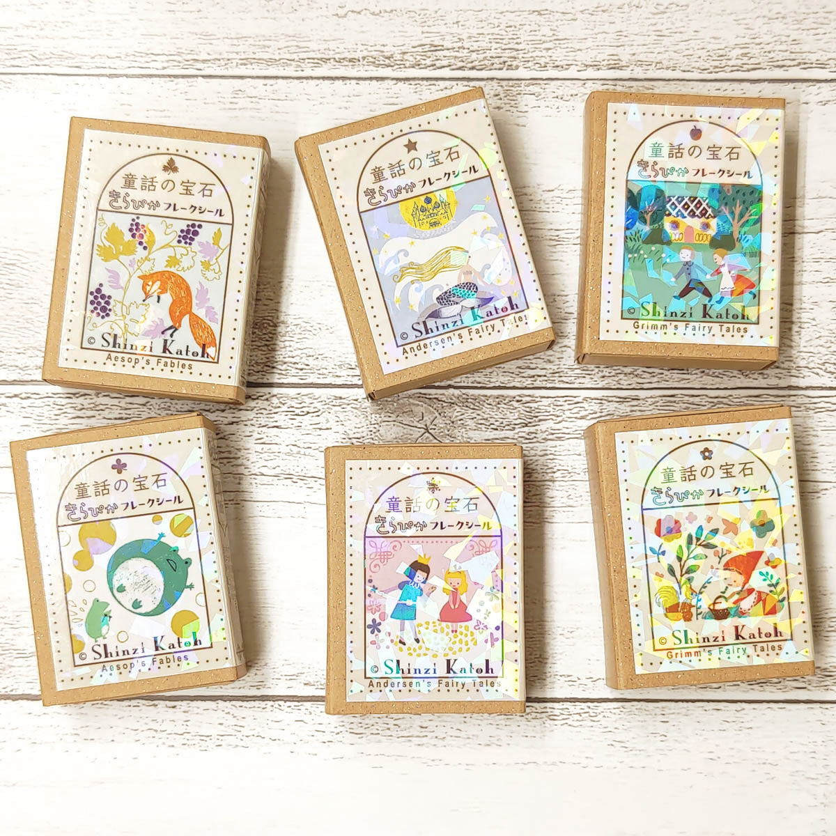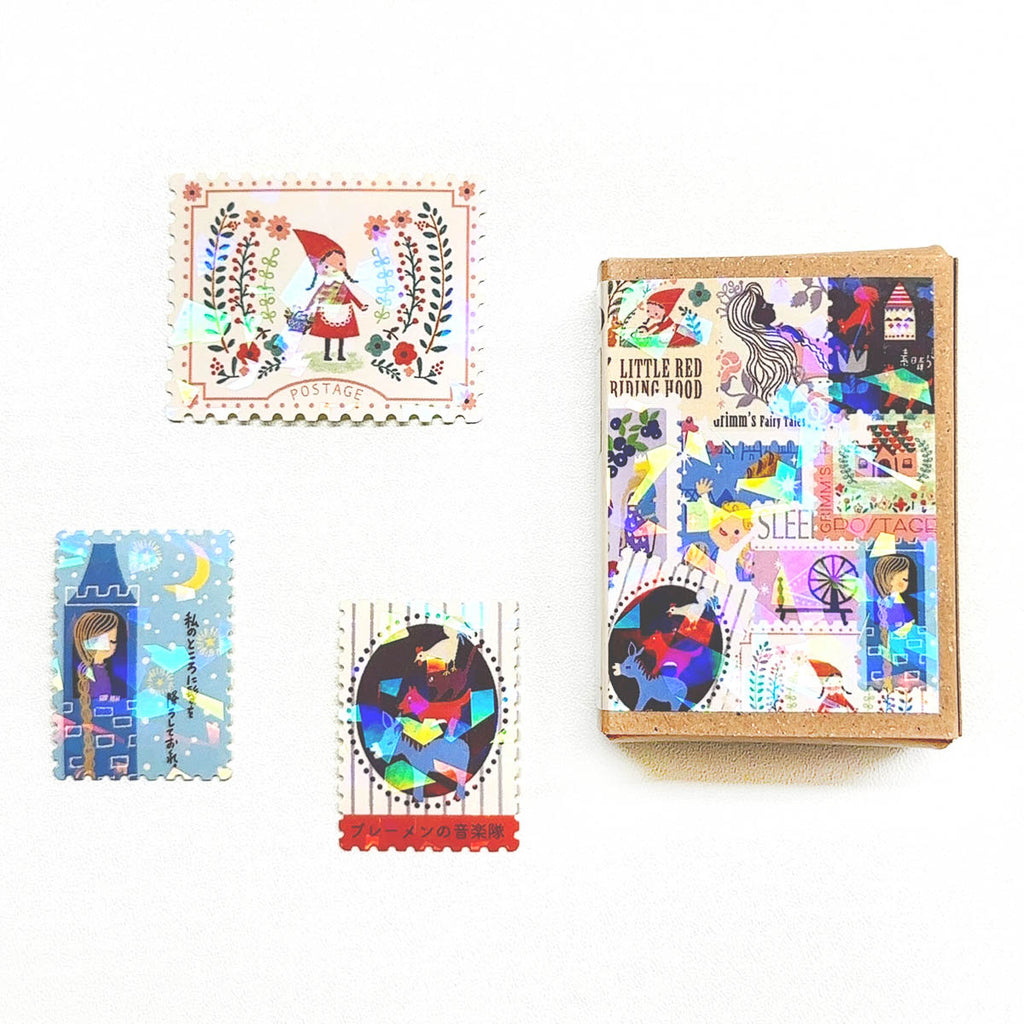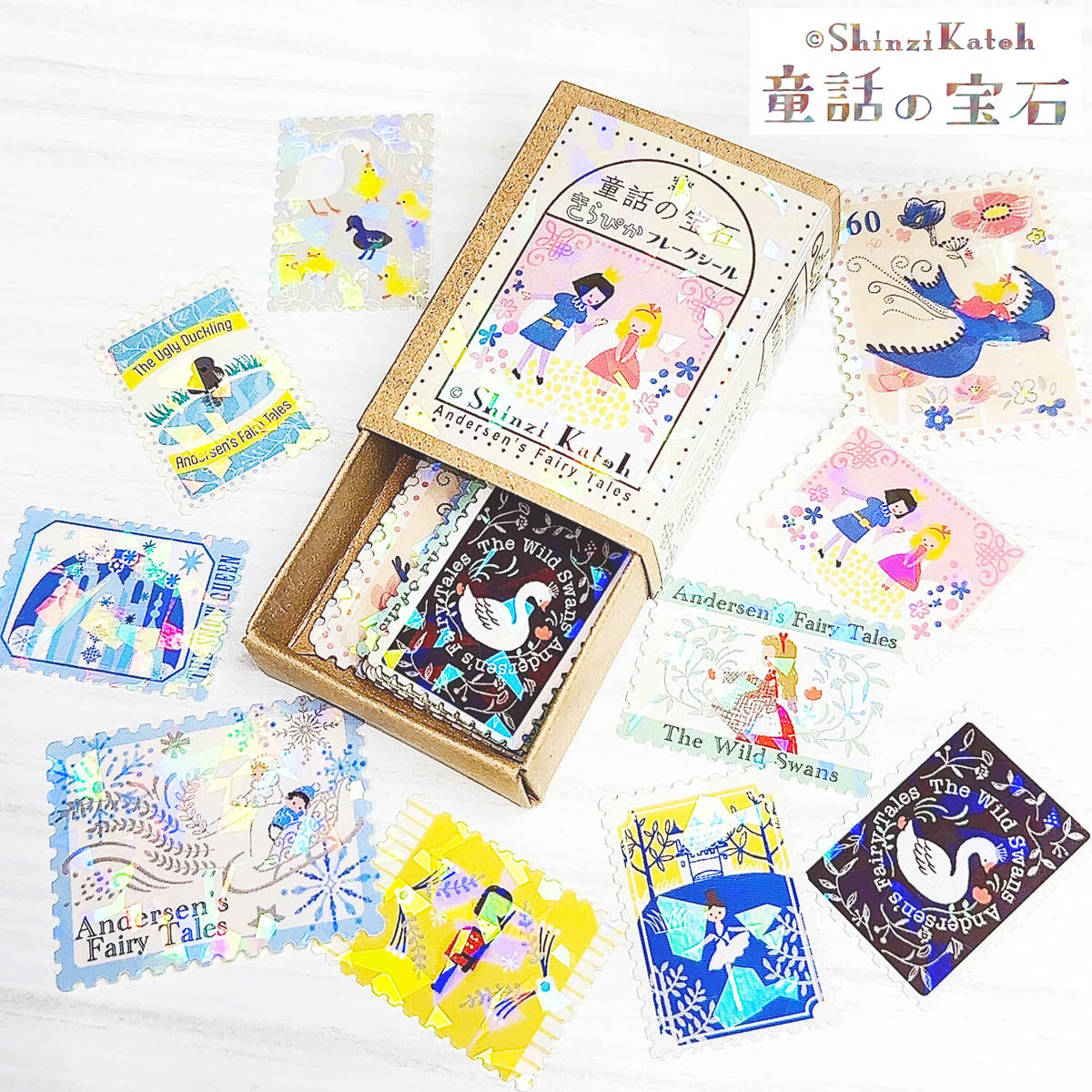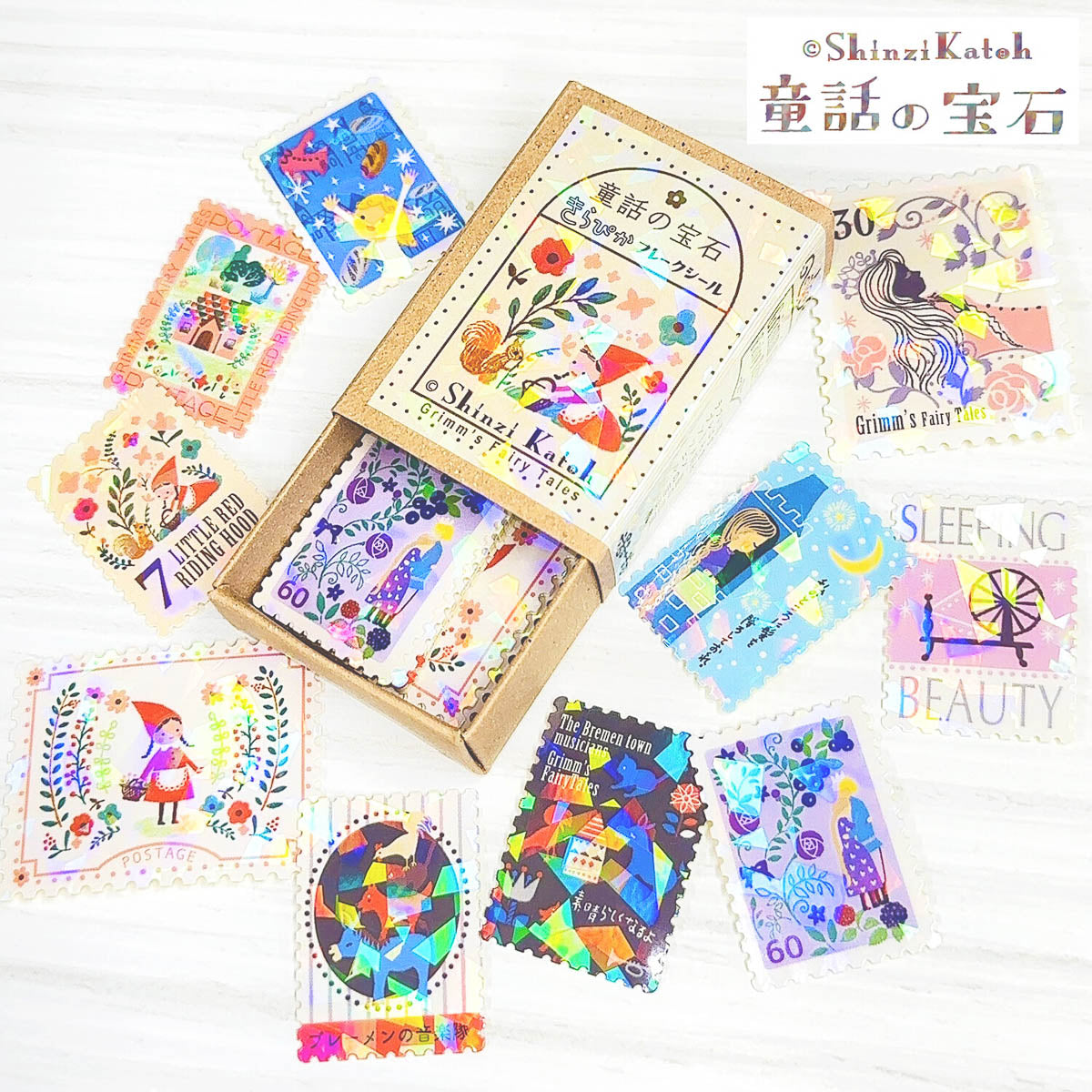 Flake-Sticker von Shinzi Katoh aus der Serie „Fairy Tale Jewels“, verpackt in einer kleinen, buchähnlichen Box mit holografischem Glanz. Die 30 briefmarkenförmigen Sticker zeigen farbenfrohe Motive aus klassischen Geschichten und lassen sich leicht mitnehmen. Ideal zum Verzieren von Notizbüchern, Briefen oder kleinen Geschenken.