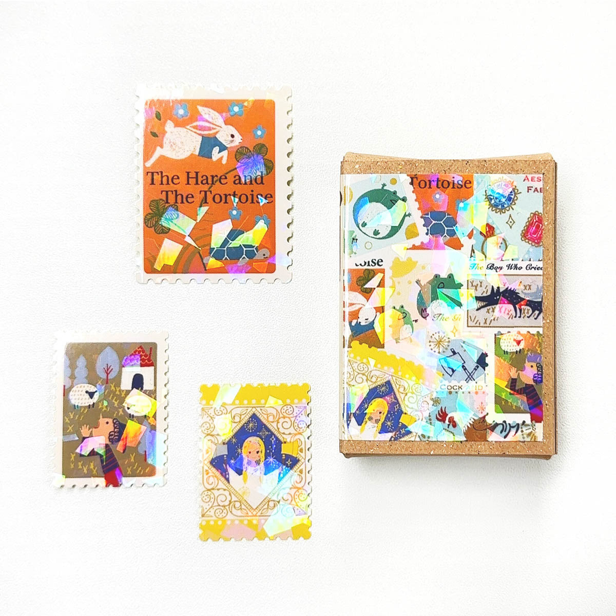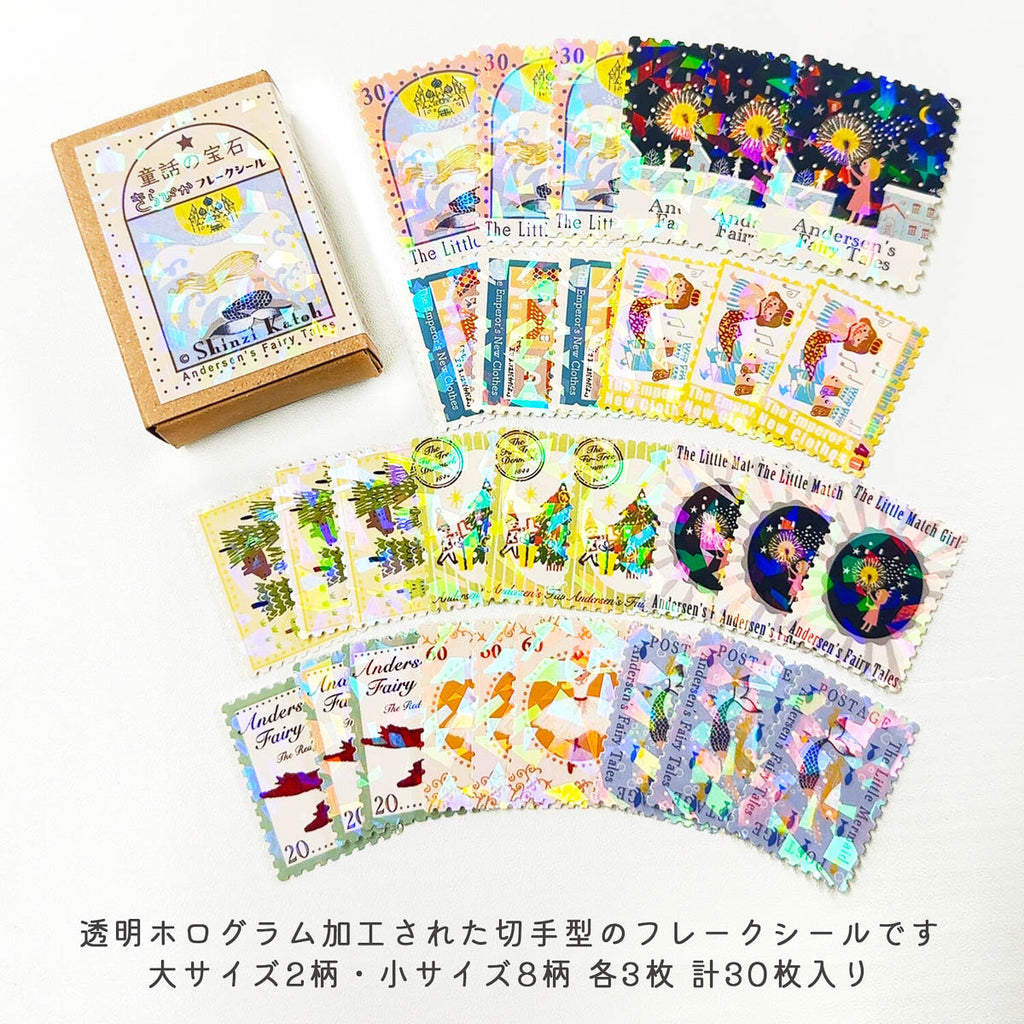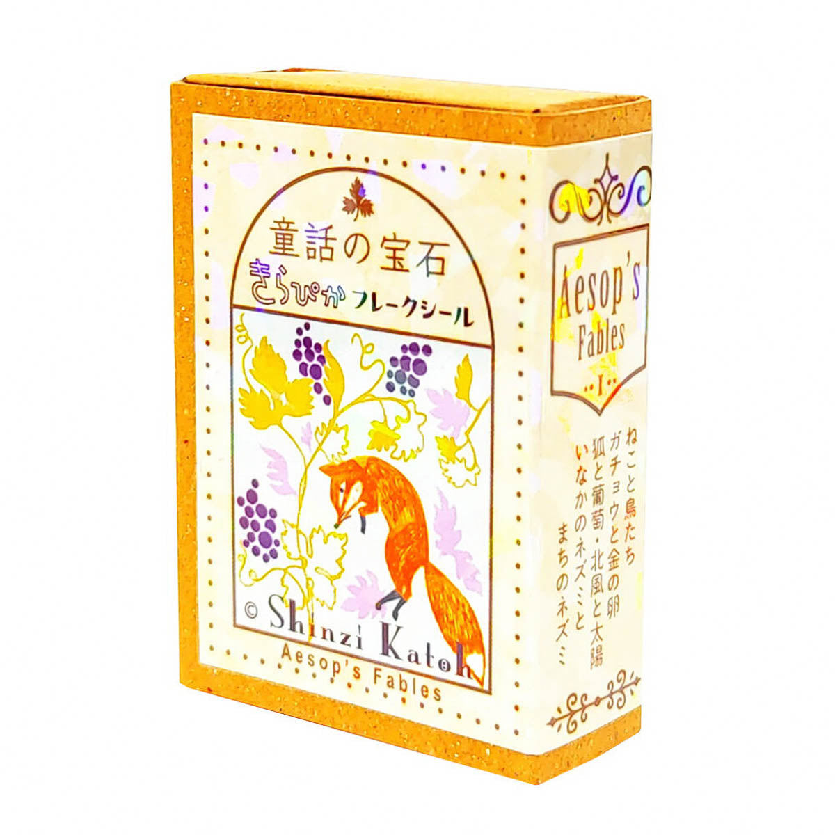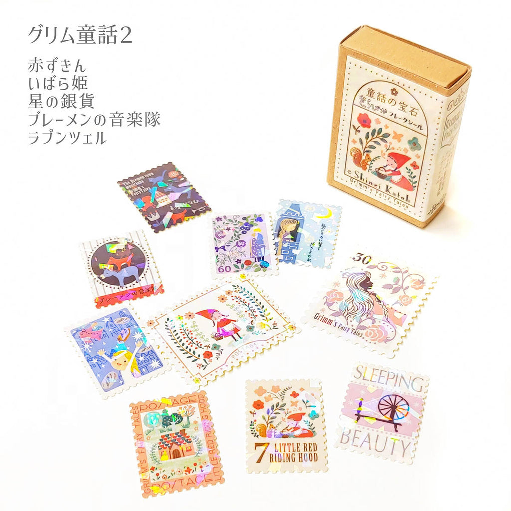 Flake-Sticker von Shinzi Katoh aus der Serie „Fairy Tale Jewels“, verpackt in einer kleinen, buchähnlichen Box mit holografischem Glanz. Die 30 briefmarkenförmigen Sticker zeigen farbenfrohe Motive aus klassischen Geschichten und lassen sich leicht mitnehmen. Ideal zum Verzieren von Notizbüchern, Briefen oder kleinen Geschenken.