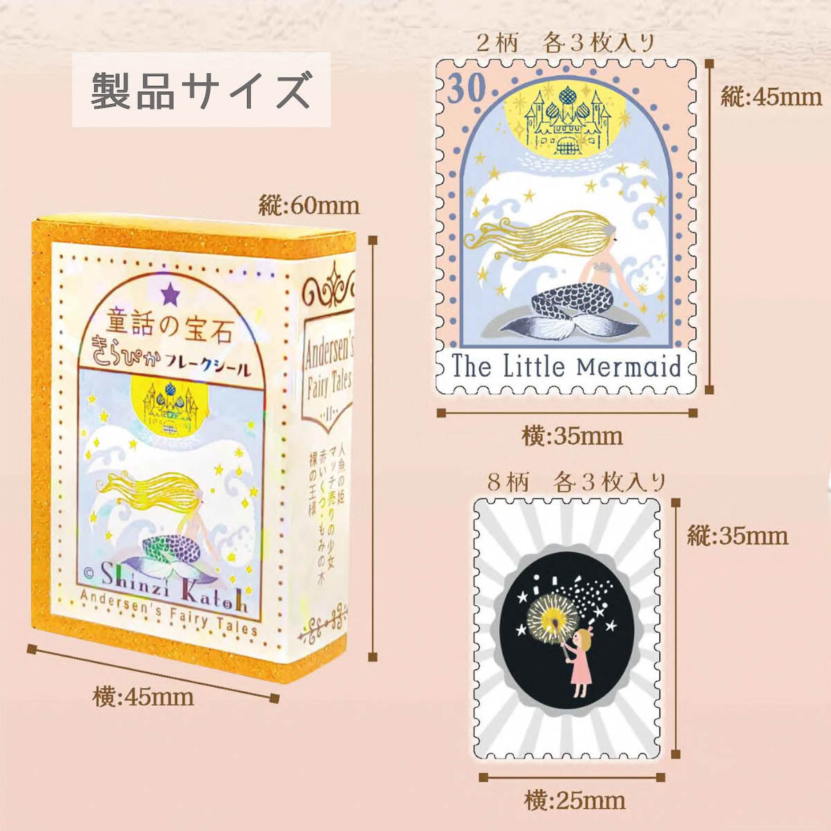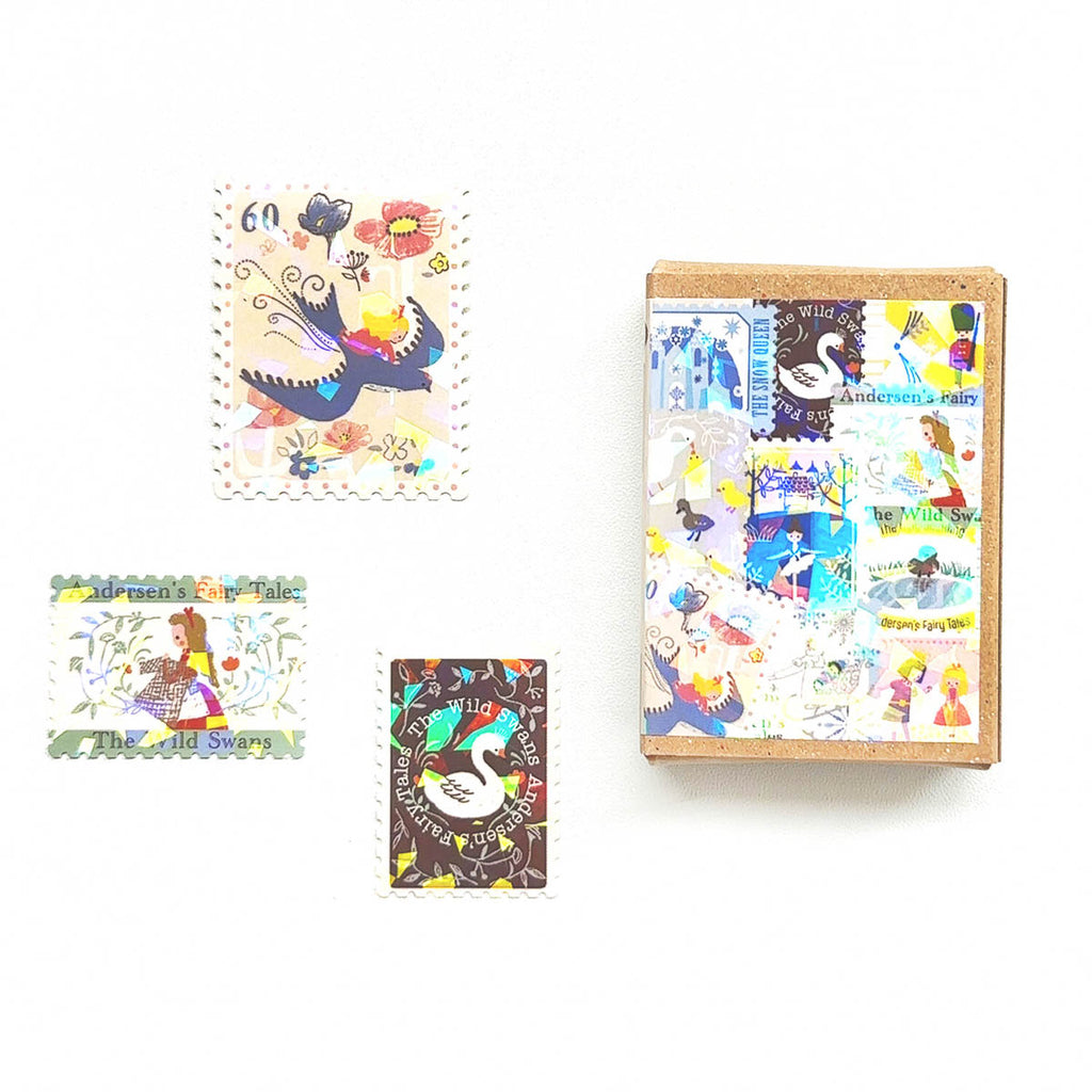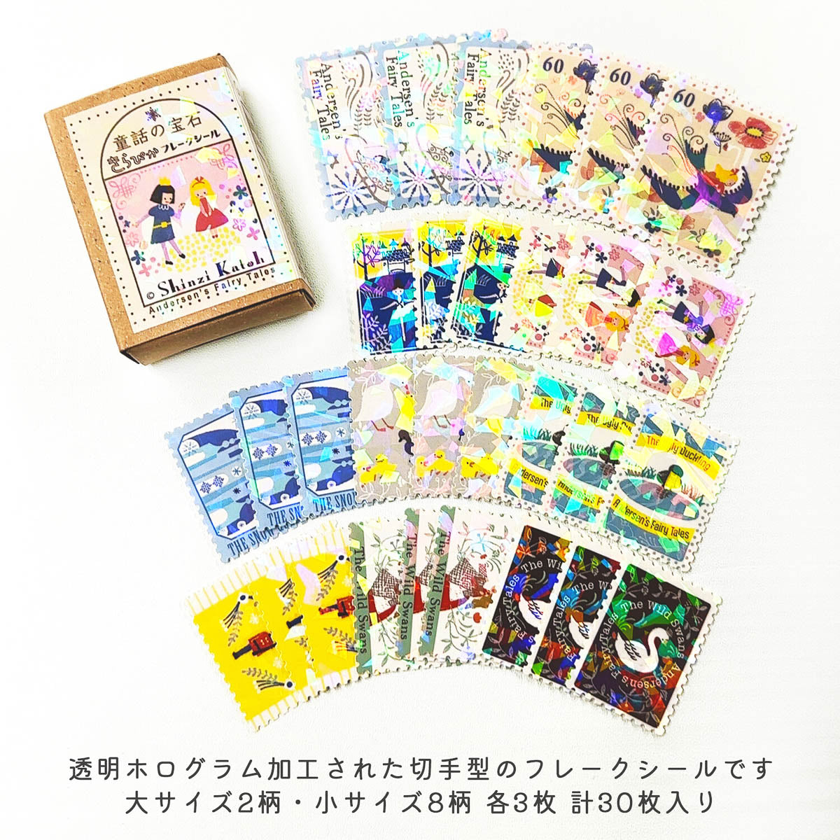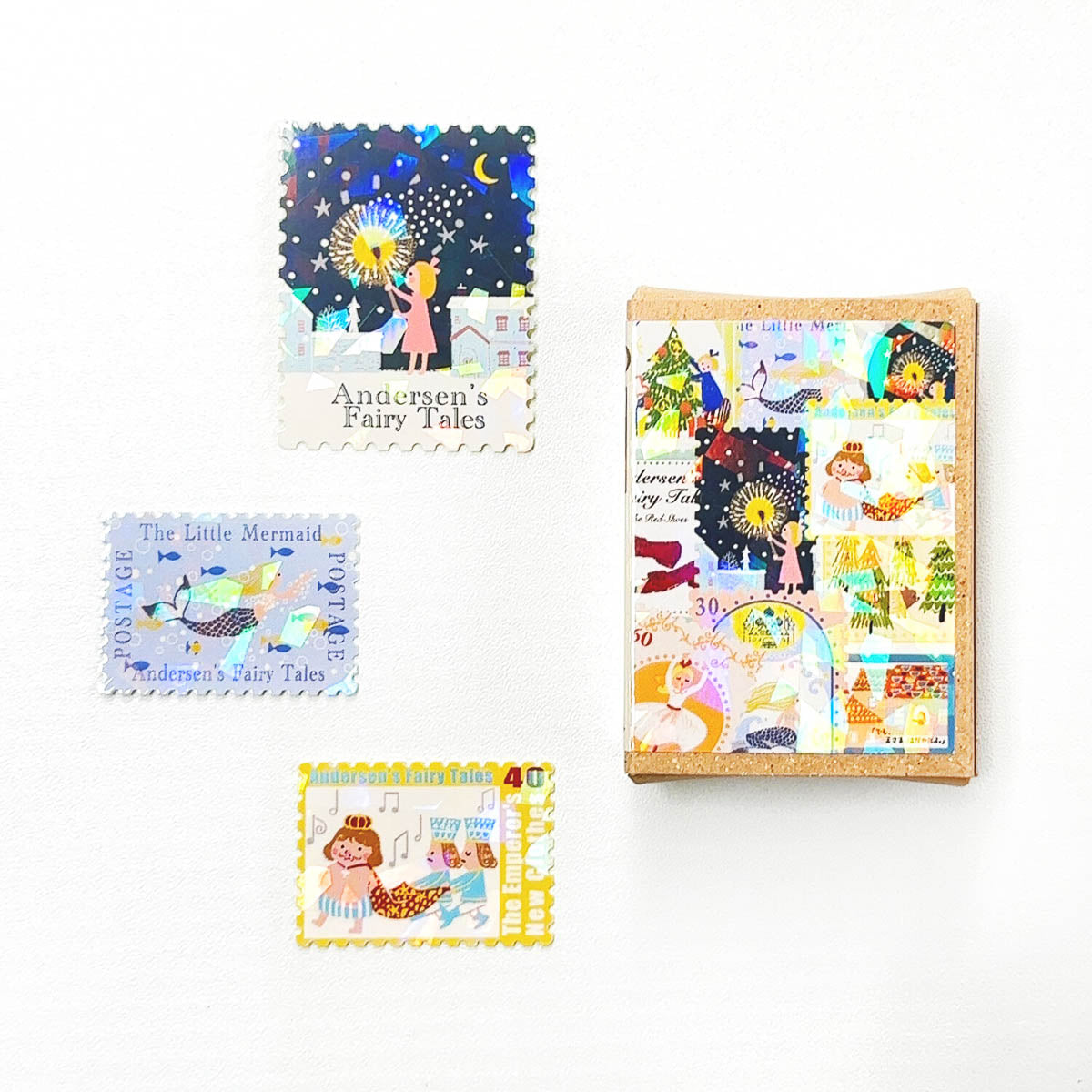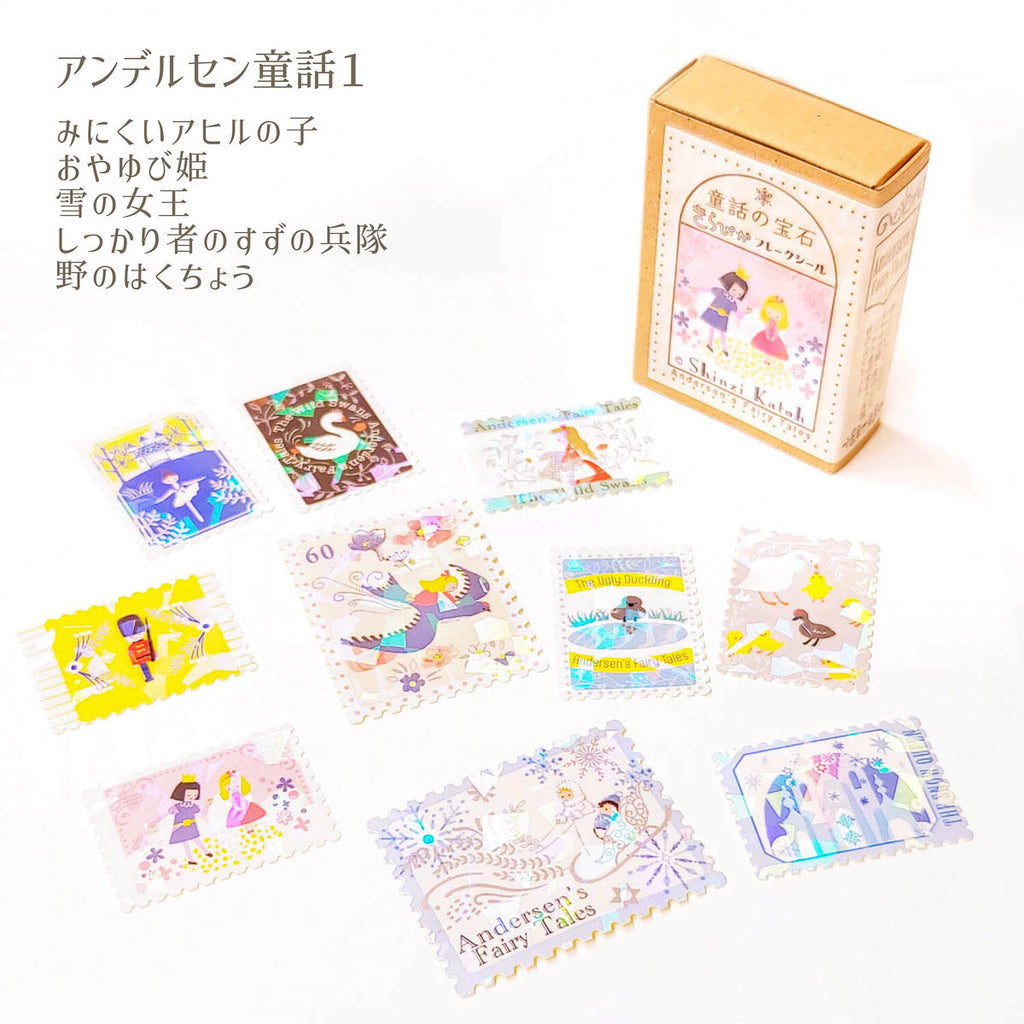 Flake-Sticker von Shinzi Katoh aus der Serie „Fairy Tale Jewels“, verpackt in einer kleinen, buchähnlichen Box mit holografischem Glanz. Die 30 briefmarkenförmigen Sticker zeigen farbenfrohe Motive aus klassischen Geschichten und lassen sich leicht mitnehmen. Ideal zum Verzieren von Notizbüchern, Briefen oder kleinen Geschenken.