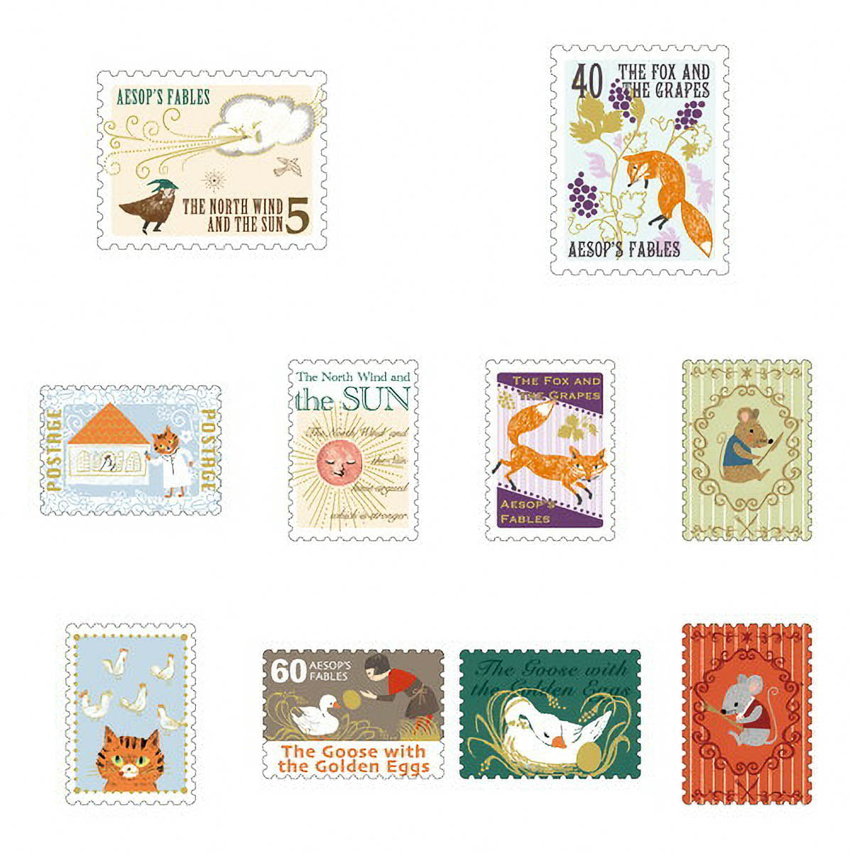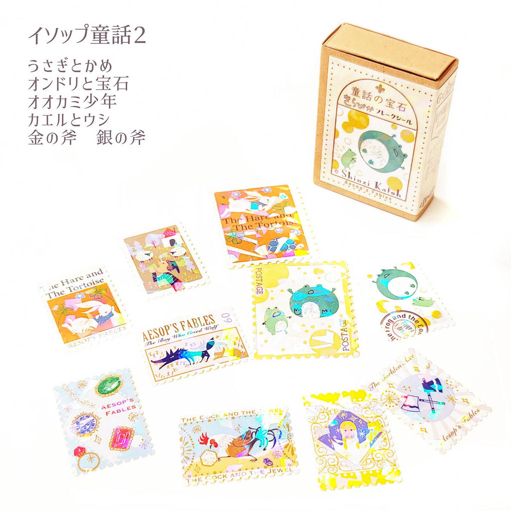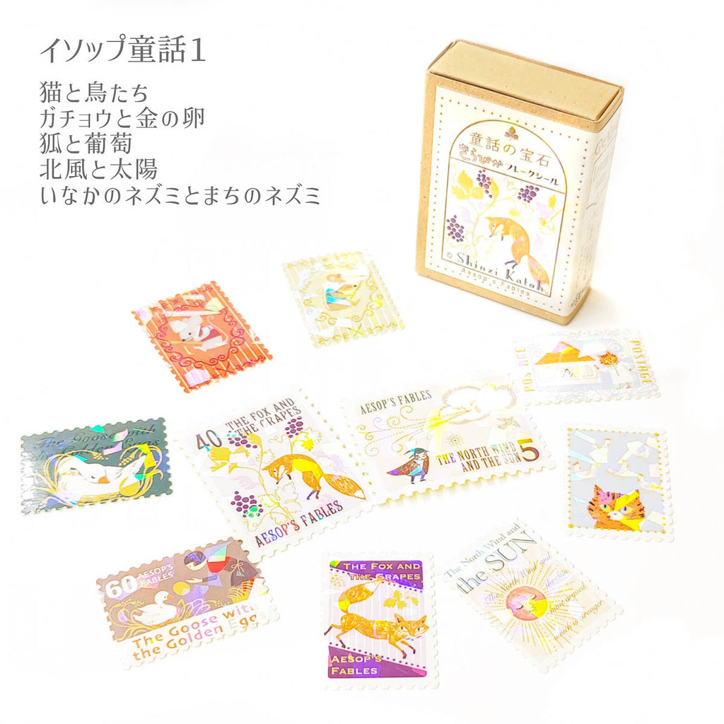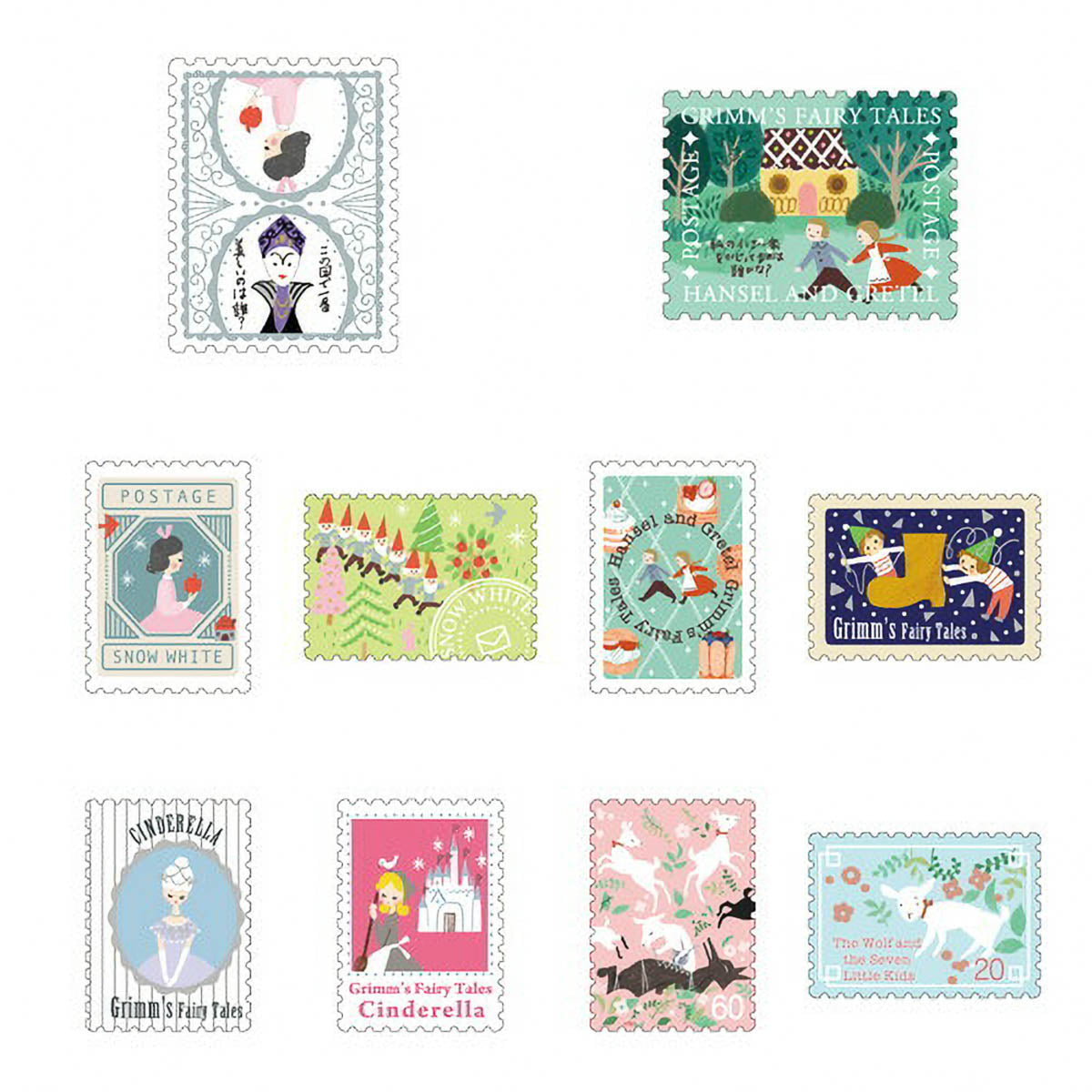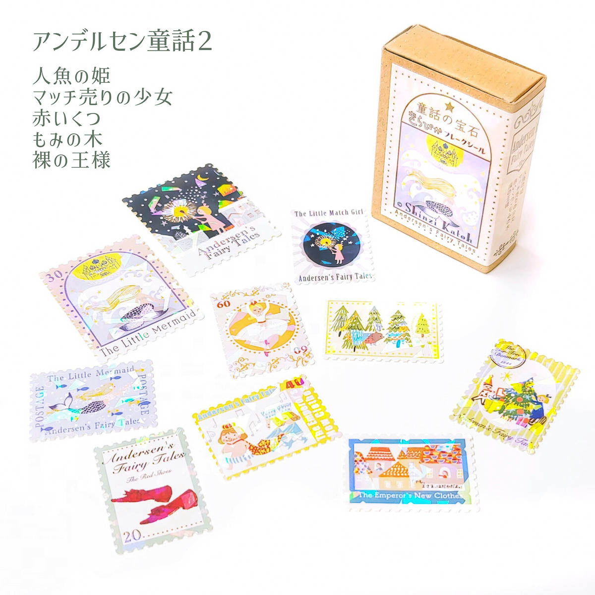 Flake-Sticker von Shinzi Katoh aus der Serie „Fairy Tale Jewels“, verpackt in einer kleinen, buchähnlichen Box mit holografischem Glanz. Die 30 briefmarkenförmigen Sticker zeigen farbenfrohe Motive aus klassischen Geschichten und lassen sich leicht mitnehmen. Ideal zum Verzieren von Notizbüchern, Briefen oder kleinen Geschenken.