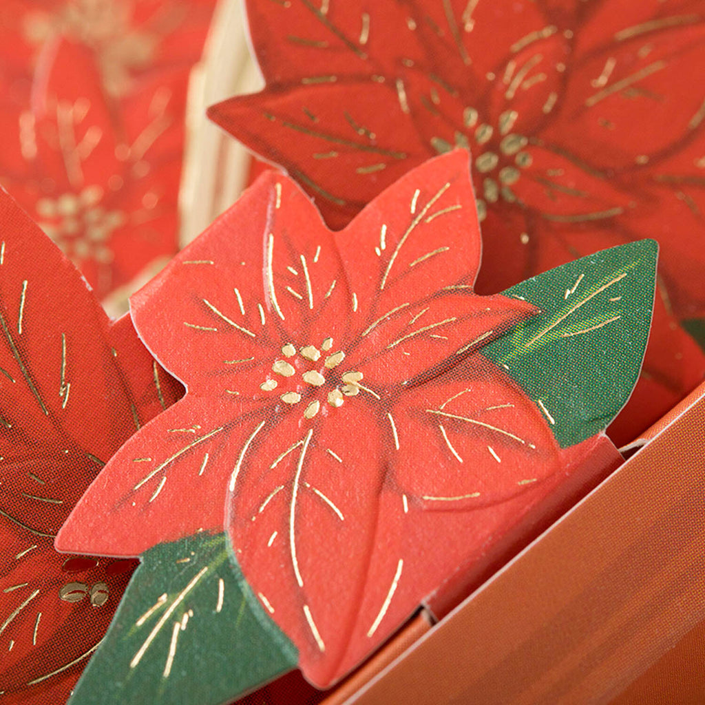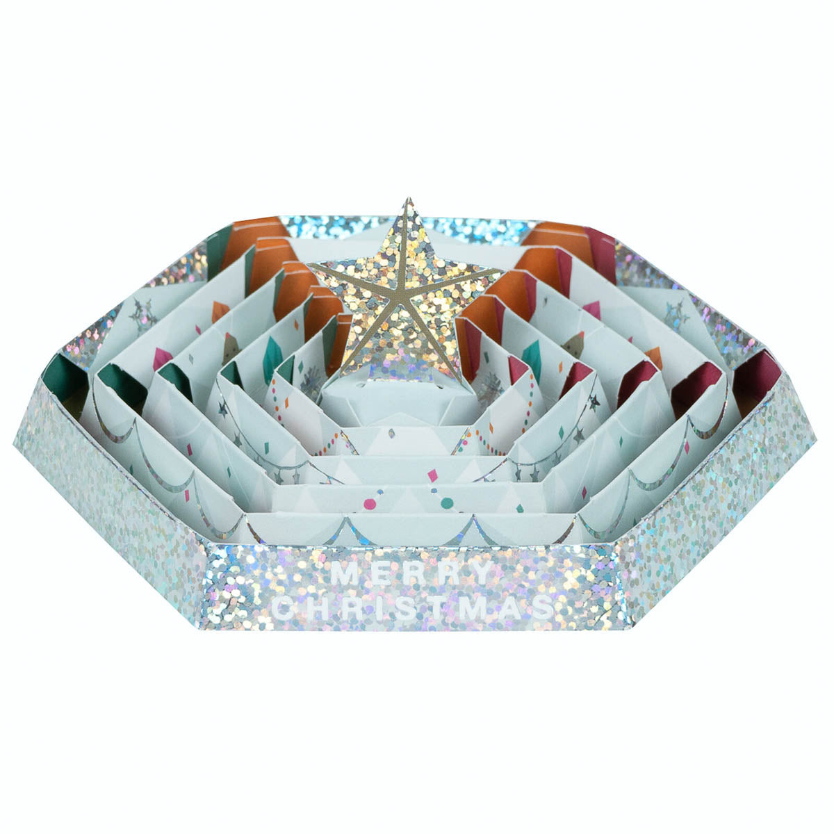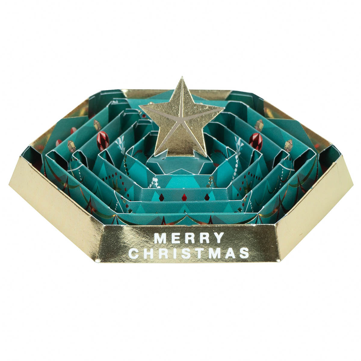 Die Pop-up-Karte entfaltet sich beim Ziehen zu einem festlichen Weihnachtsbaum oder Weihnachtsstern. Goldfolien-Details verleihen der Karte eine edle Note – ideal für besondere Weihnachtsgrüße. (Mit Umschlag)