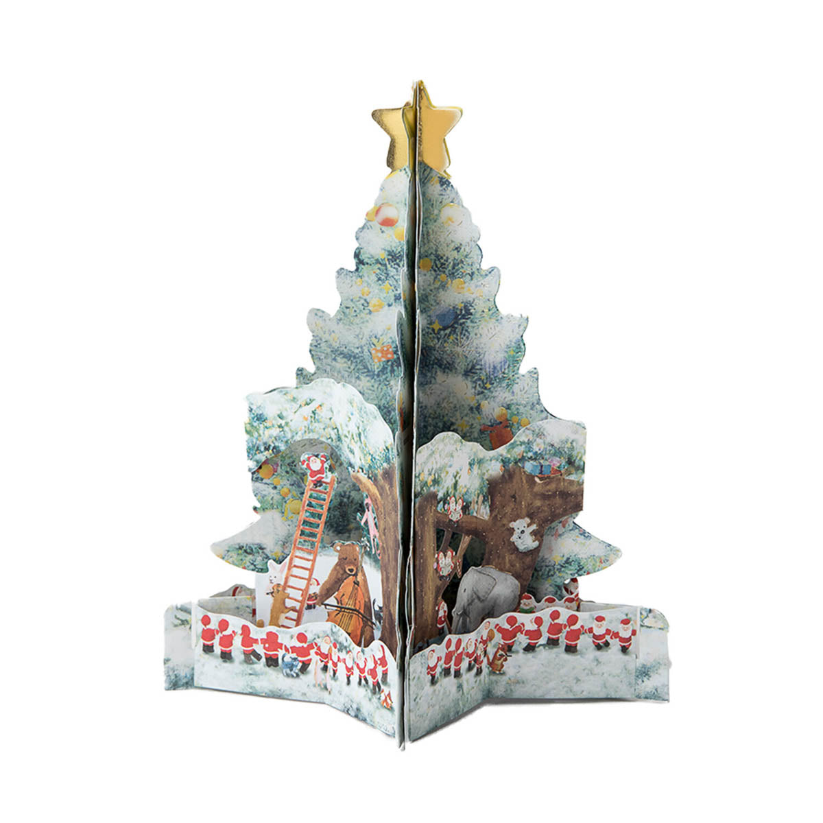Die Panorama-Pop-up-Karte zeigt eine fröhliche Waldmusikantenszene mit dem Mini-Weihnachtsmann. Durch einen Magnetverschluss lässt sie sich leicht zu einer dreidimensionalen Dekoration aufstellen. Eine niedliche Karte, die Weihnachtsstimmung auf jedem Tisch verbreitet.