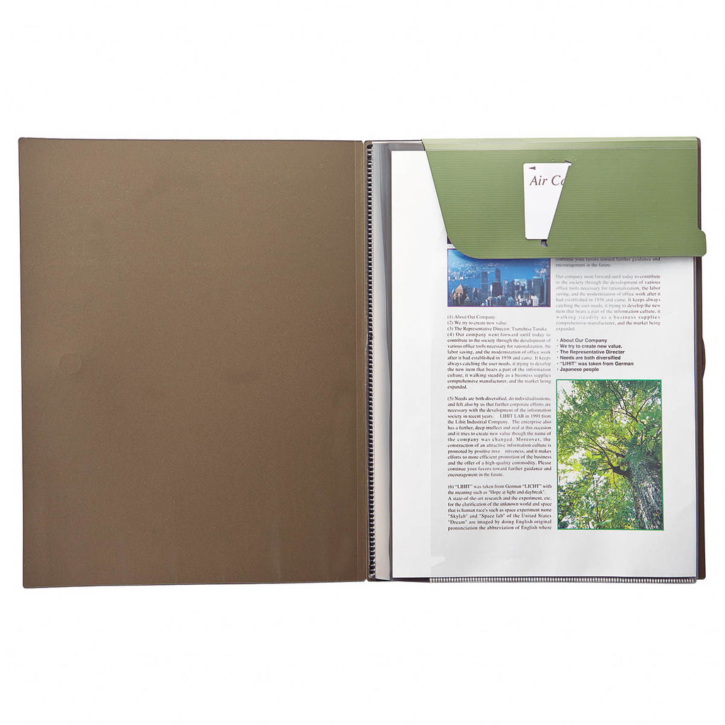 Die Mappe im A4-Format bietet mit insgesamt zehn offenen Fächern plus einem zusätzlichen Fach mit Klappe viel Platz für A3-Unterlagen und kleine Utensilien. Die weit öffnenden Taschen erleichtern das Einsortieren großformatiger Dokumente und halten Inhalte übersichtlich zusammen. Das abschließende Klappenfach eignet sich ideal für kleinere Gegenstände.