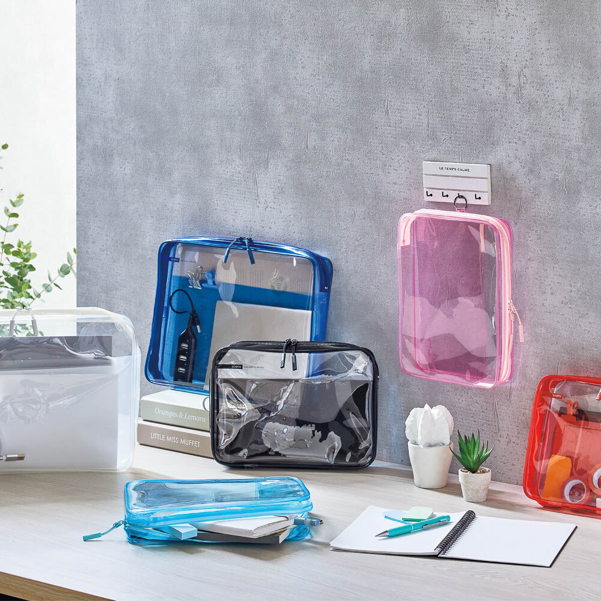 Die klare Boxentasche lässt sich weit öffnen und ermöglicht ein leichtes Ein- und Ausräumen von A5-Notizen und kleinen Utensilien. Ein integrierter Ring erlaubt das Aufhängen, während ein Innenfach auf der Rückseite zusätzlichen Stauraum für Kleinteile bietet. Dank Doppelreißverschluss und transparentem Material kann ein Smartphone auch im Inneren bedient werden, sodass die Tasche auch als praktischer Organizer im Rucksack geeignet ist.