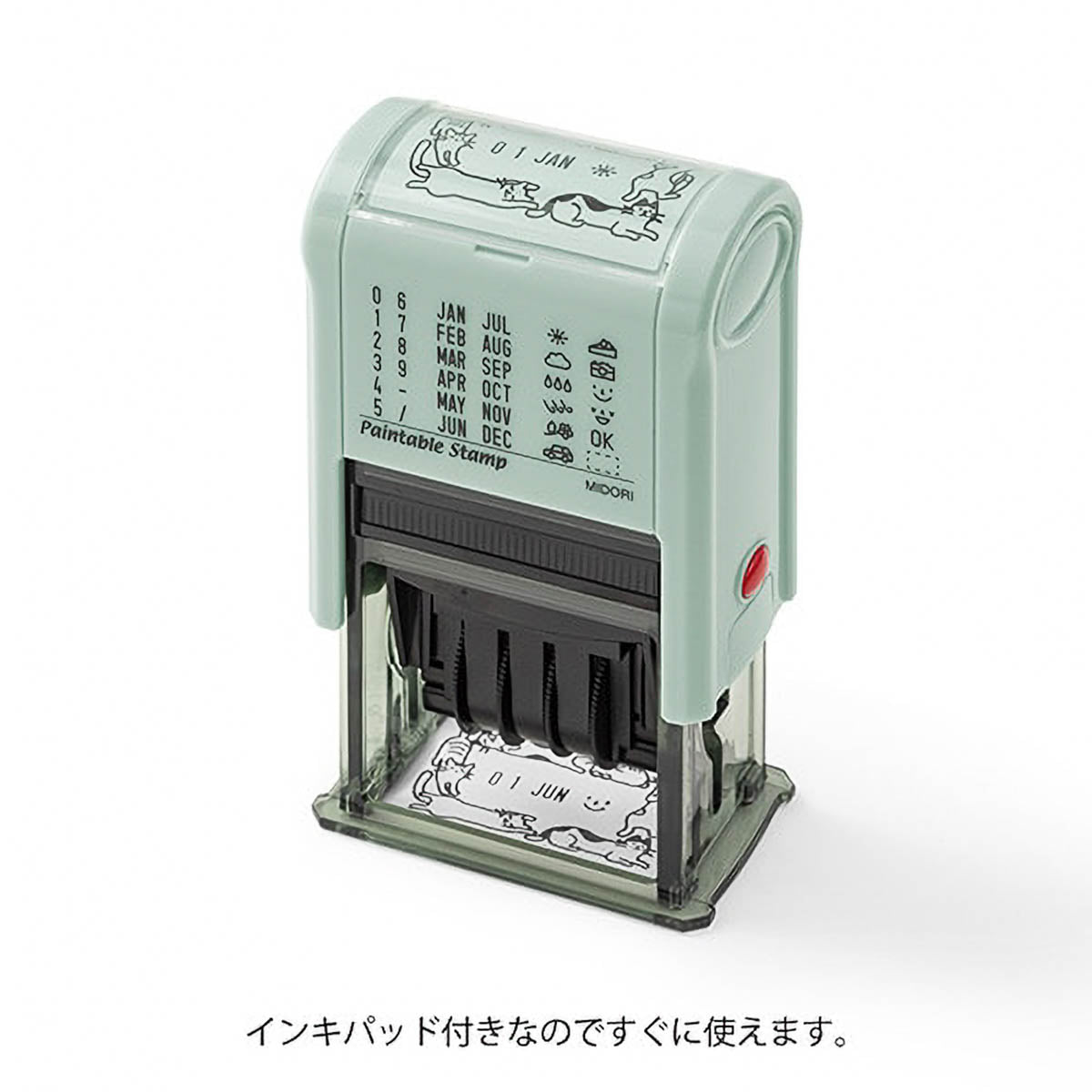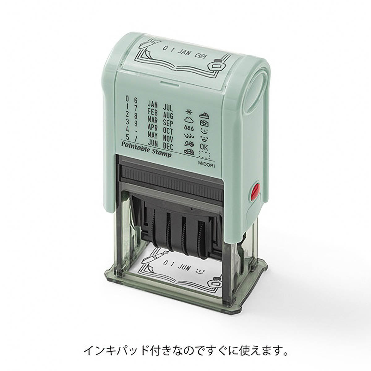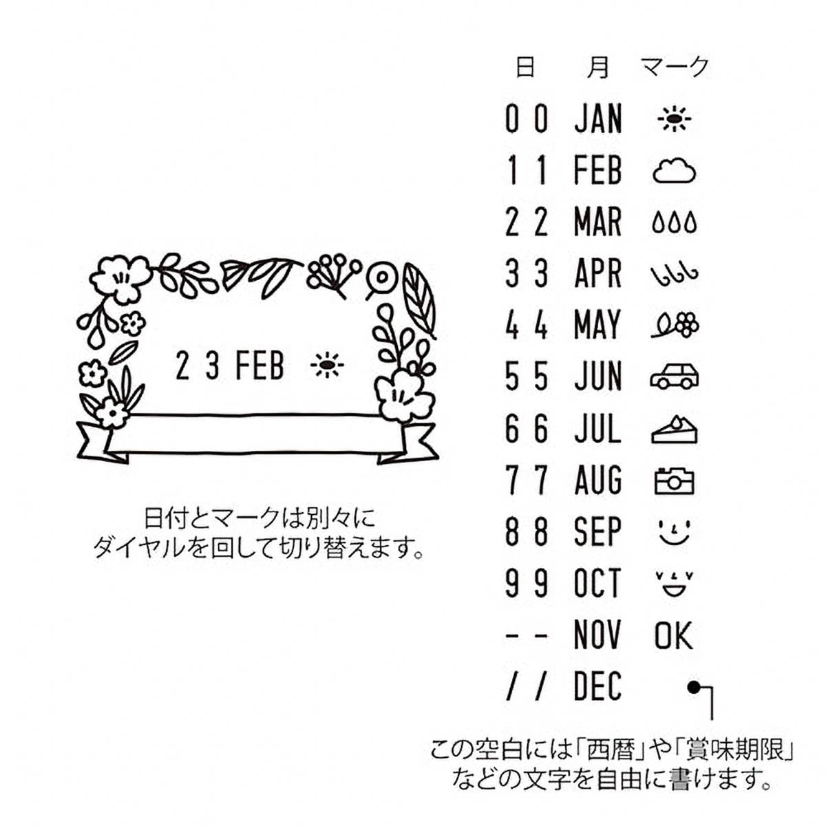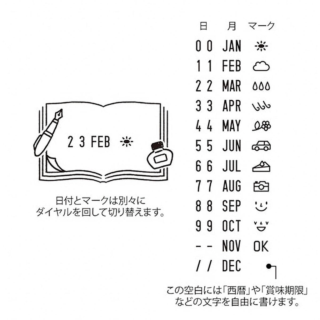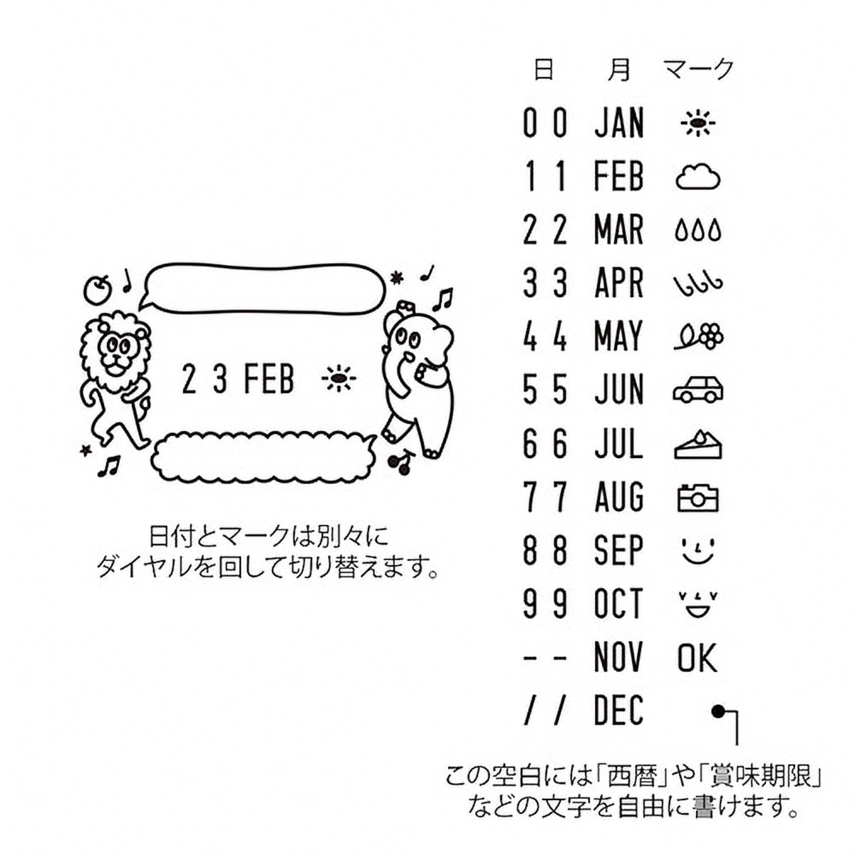 This is a rotating date stamp that you can paint and arrange after pressing it. Turn the dial to change the date. The ink is oil-based pigment, so it will not bleed even if you paint over the stamp with a water-based marker. It is also recommended for colorfully decorating notebooks, diaries, albums, etc.