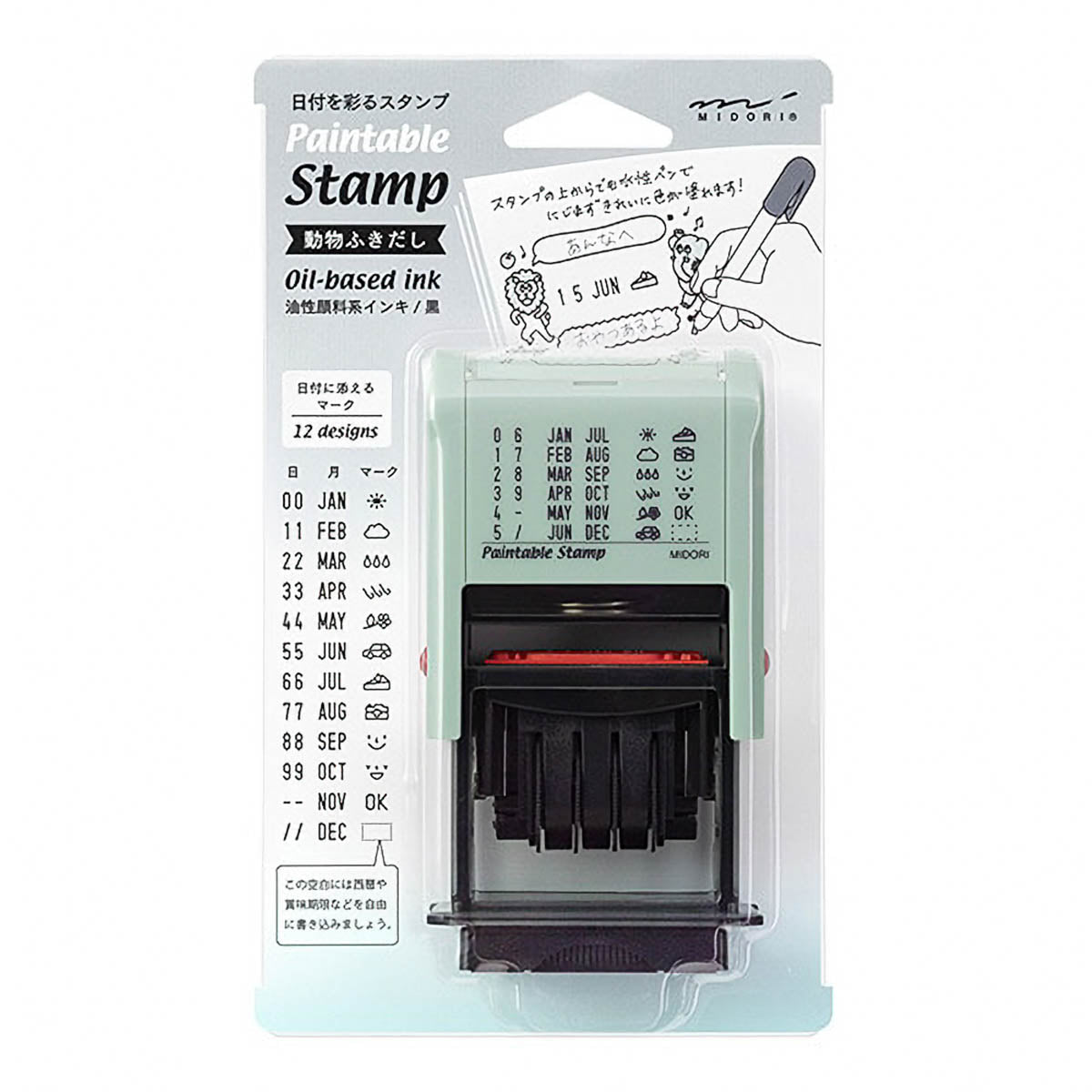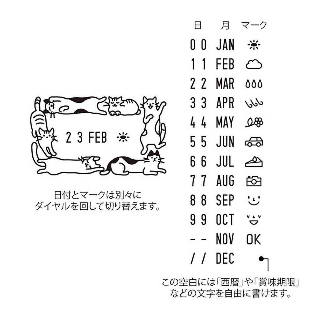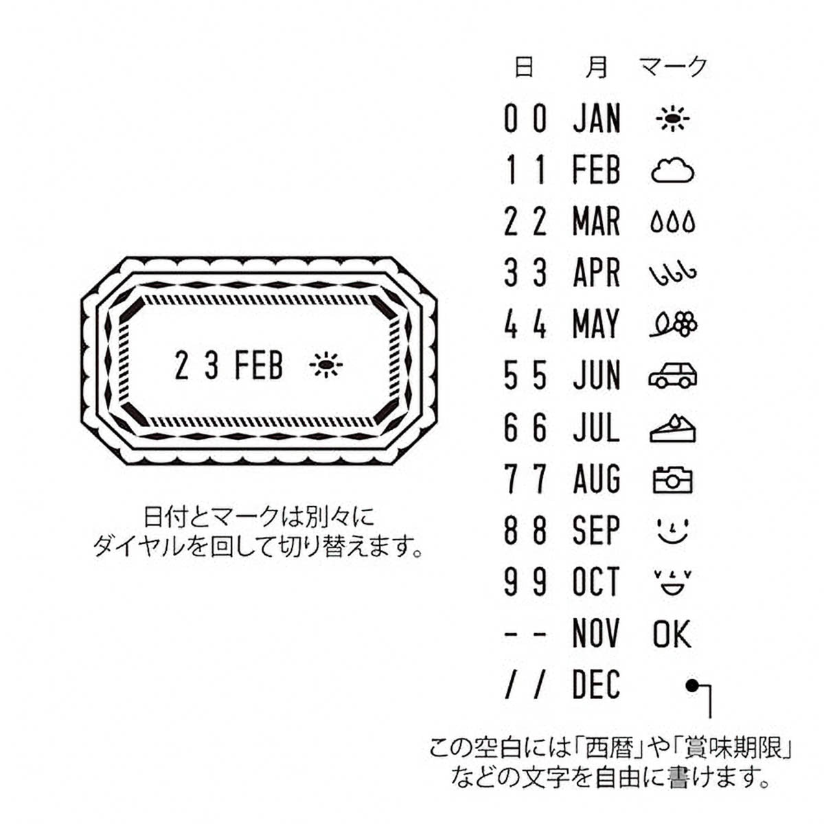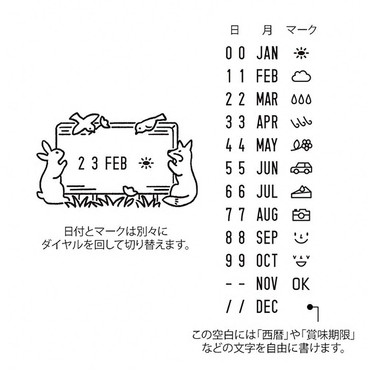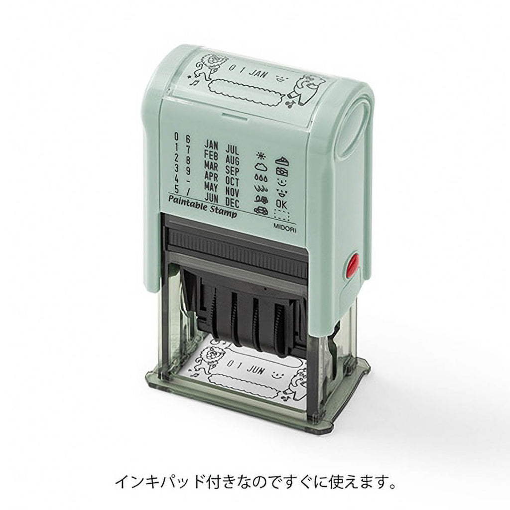 This is a rotating date stamp that you can paint and arrange after pressing it. Turn the dial to change the date. The ink is oil-based pigment, so it will not bleed even if you paint over the stamp with a water-based marker. It is also recommended for colorfully decorating notebooks, diaries, albums, etc.