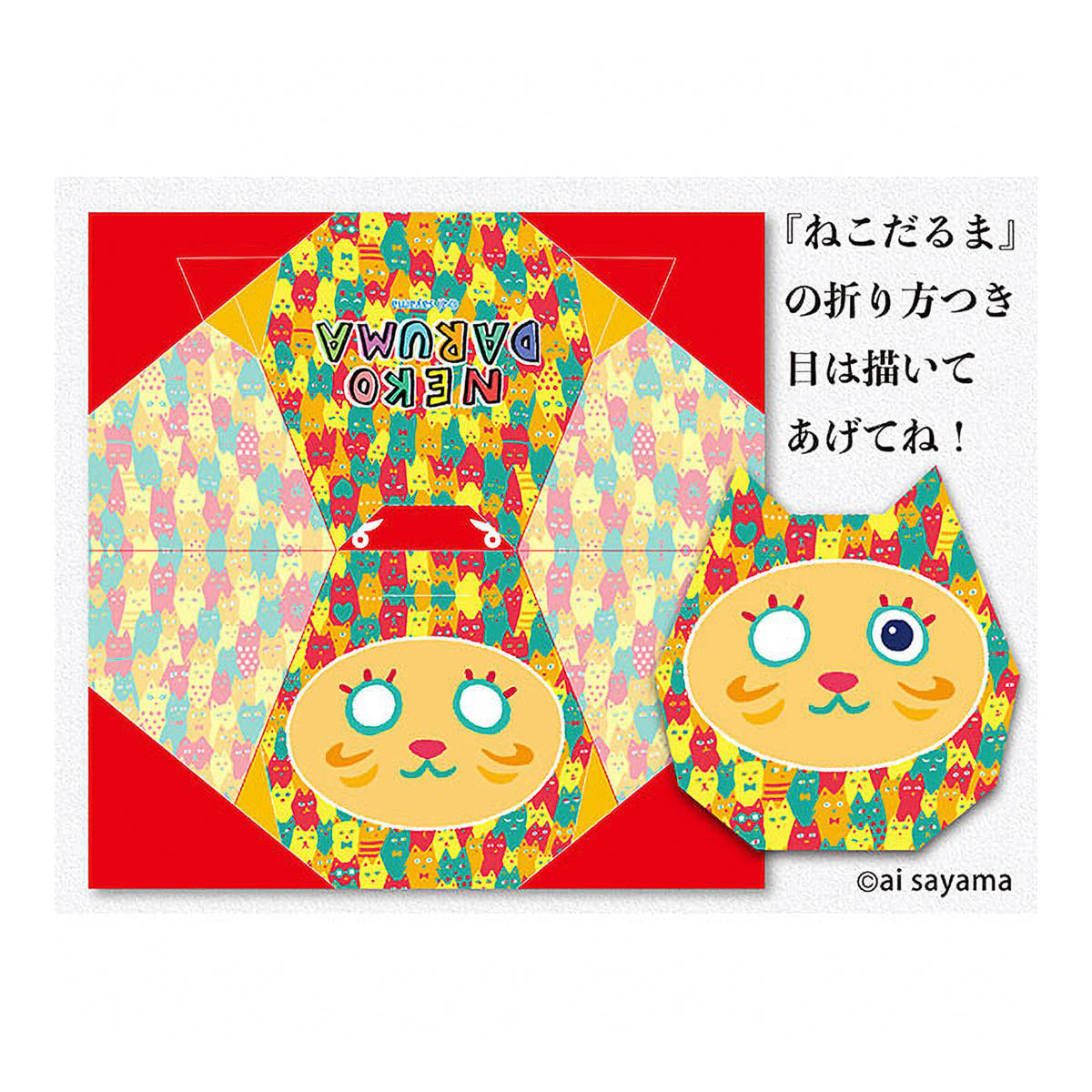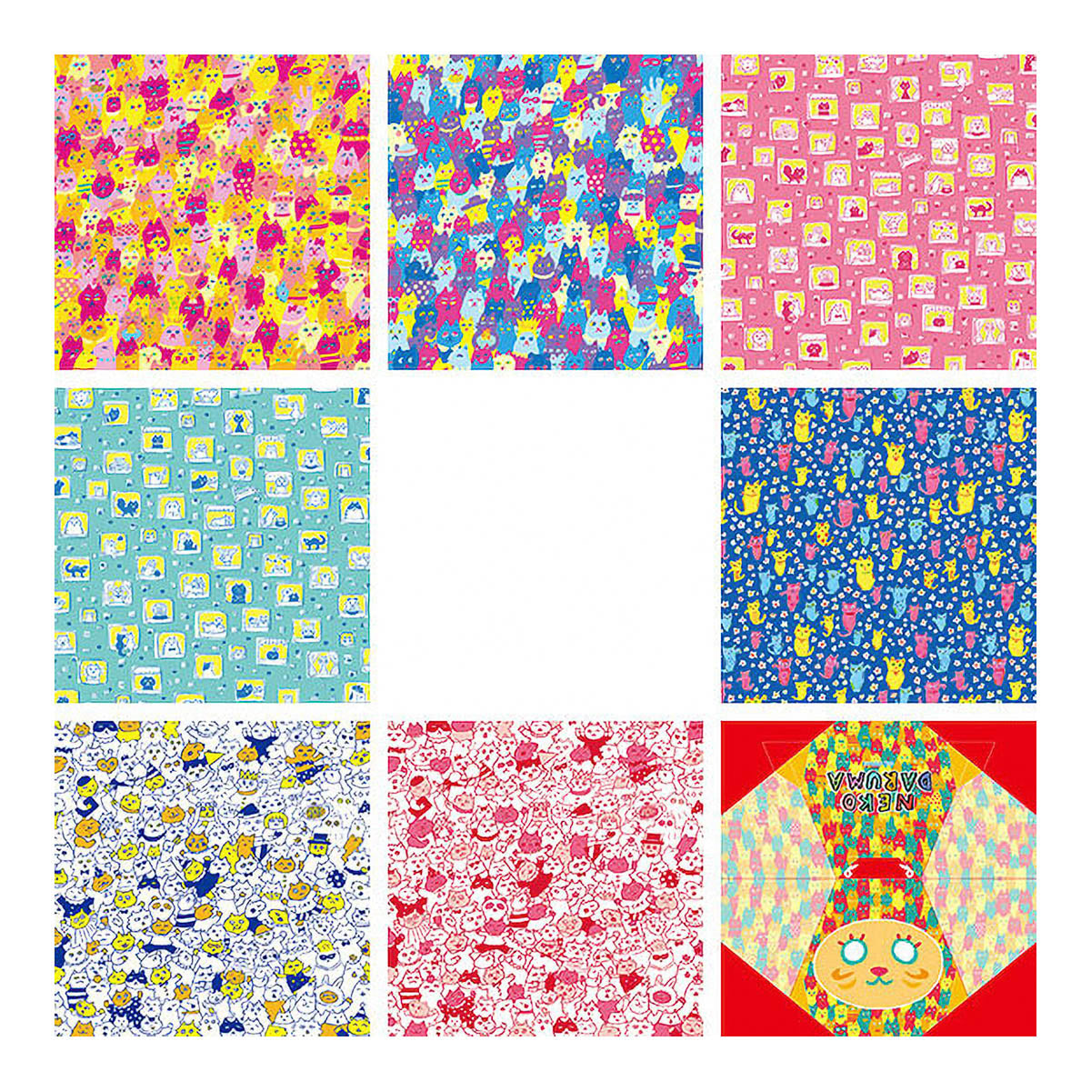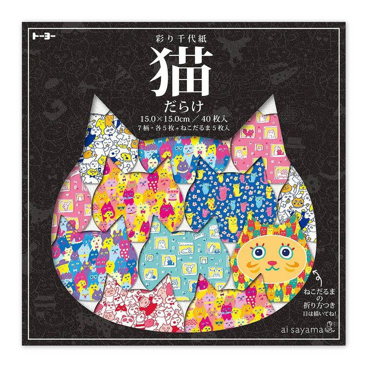 Inhalt: 40 Blätter (Chiyogami: 7 Designs mit je 5 Blatt (35 Blatt) Origami mit Glücksmotiv „Neko-Daruma“: 5 Blatt)