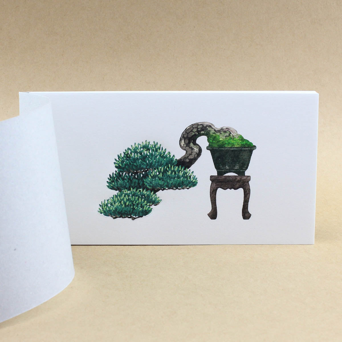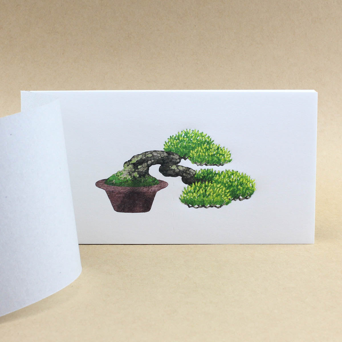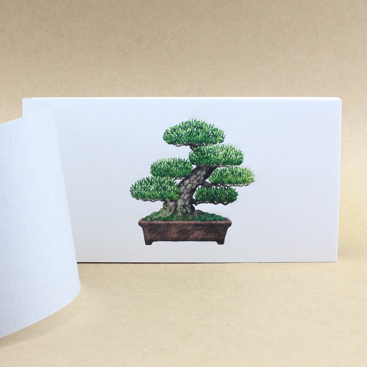 Ein dekoratives Memopad mit Bonsai-Motiv aus Japan. Die Blätter sind formgestanzt und ergeben beim Aufstellen eine kleine Baumform. Geeignet für kurze Notizen und als schlichte Schreibtischdekoration.