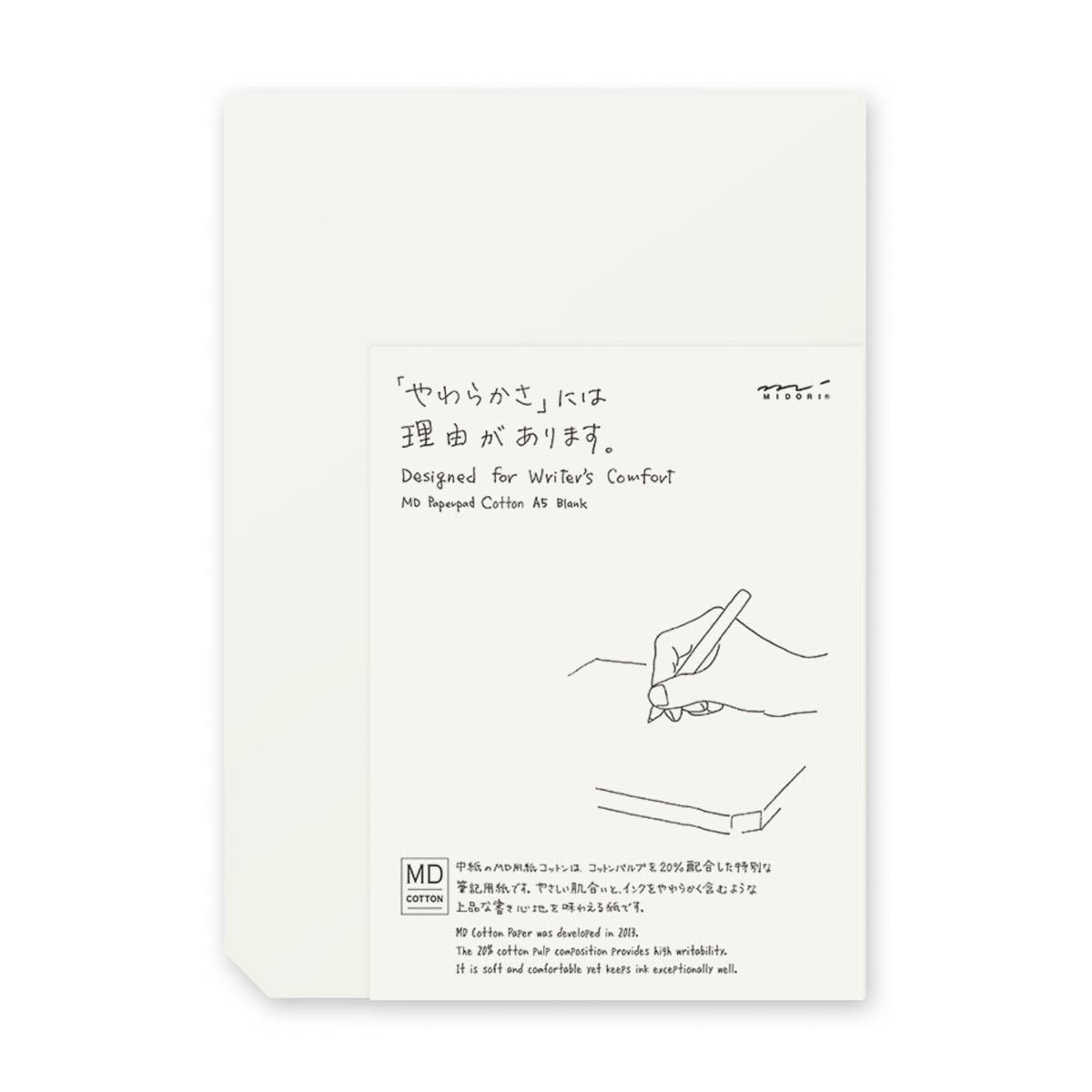 Das MD Paper Pad Cotton bietet eine weiße, angenehm weiche Papieroberfläche für freies Schreiben und Zeichnen ohne Vorgaben. Die Leimung an zwei Seiten sorgt für einen stabilen Halt der Blätter und ermöglicht das Schreiben sowohl im Hoch- als auch im Querformat. Eine abgeschrägte Ecke erleichtert das Umblättern und zeigt unabhängig von der Ausrichtung stets die richtige Stelle zum Öffnen an.