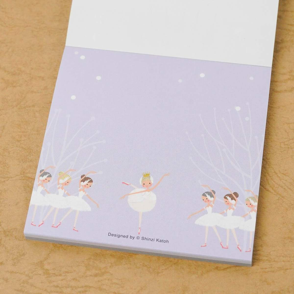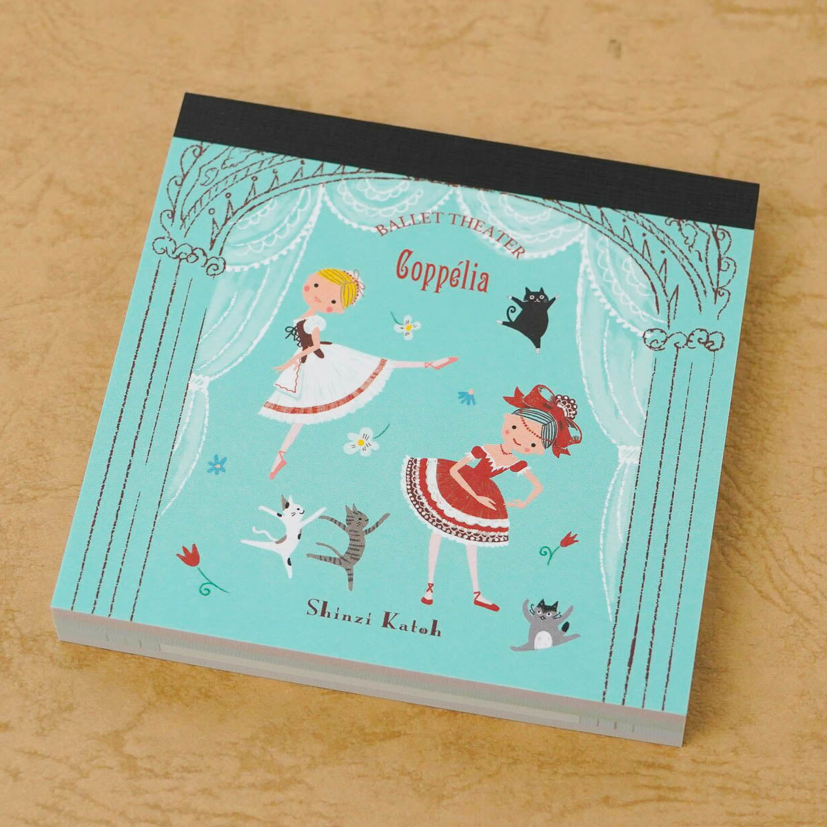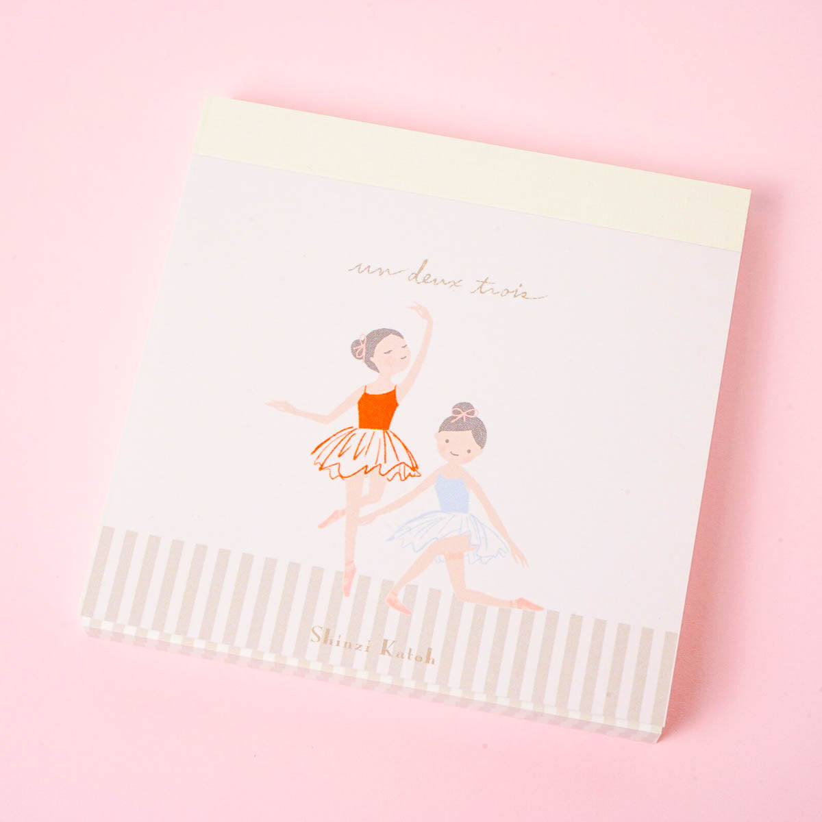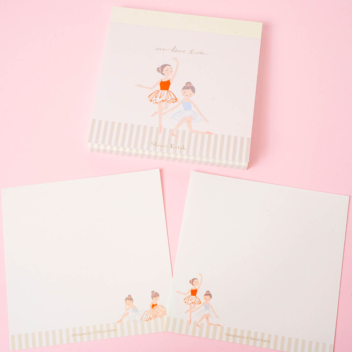 Der quadratische Notizblock zeigt von Shinzi Katoh gestaltete Illustrationen rund um das Thema Ballett, die jede Seite dezent am Rand schmücken. Die feinen Motive begleiten Alltagsnotizen wie Telefonnotizen oder Einkaufslisten. Er eignet sich sowohl für den täglichen Gebrauch als auch als kleine, liebevolle Geschenkbeigabe.