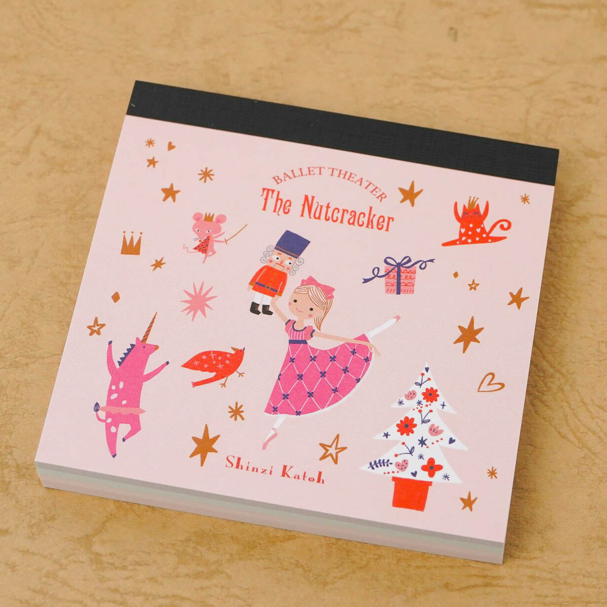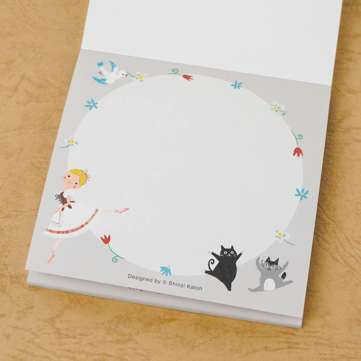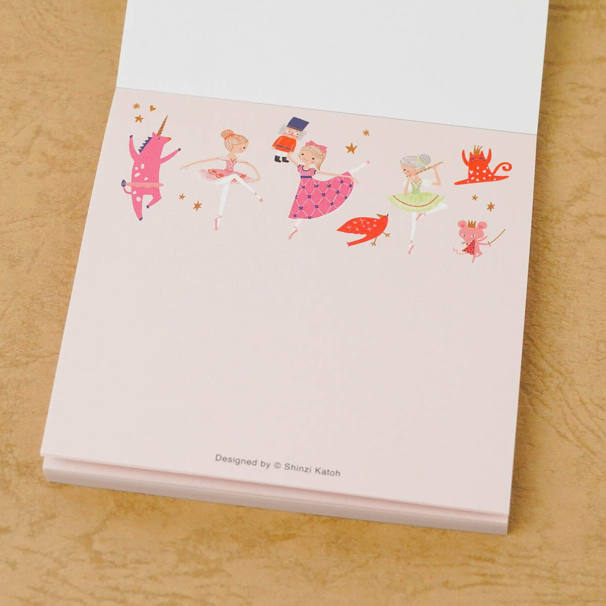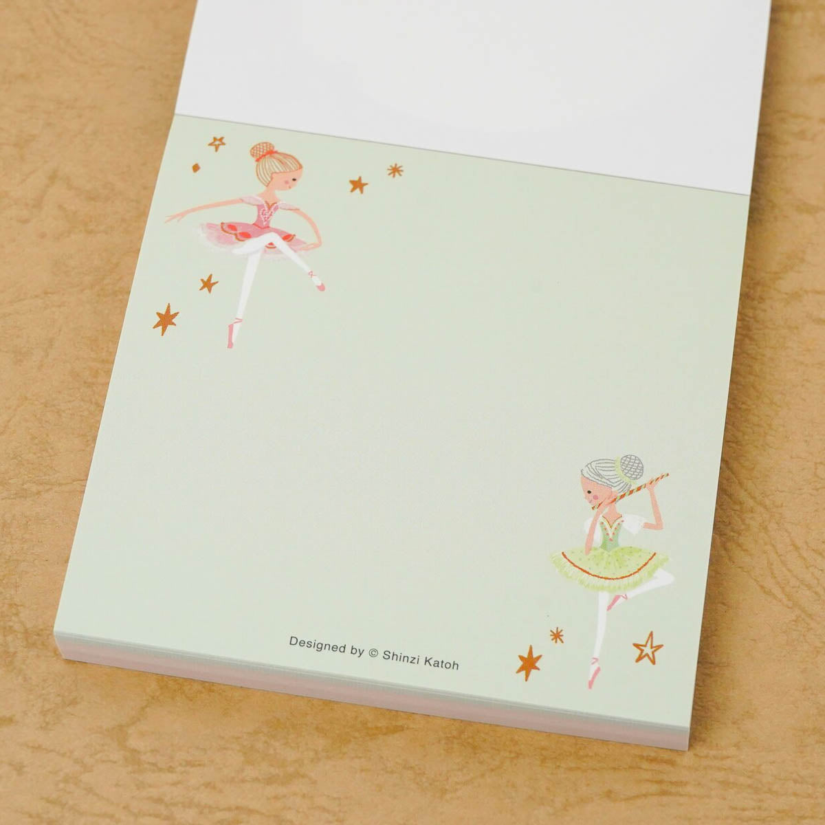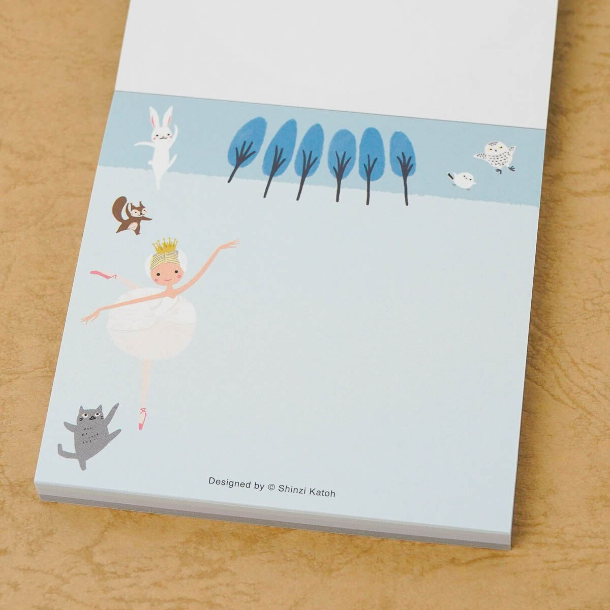 Der quadratische Notizblock zeigt von Shinzi Katoh gestaltete Illustrationen rund um das Thema Ballett, die jede Seite dezent am Rand schmücken. Die feinen Motive begleiten Alltagsnotizen wie Telefonnotizen oder Einkaufslisten. Er eignet sich sowohl für den täglichen Gebrauch als auch als kleine, liebevolle Geschenkbeigabe.