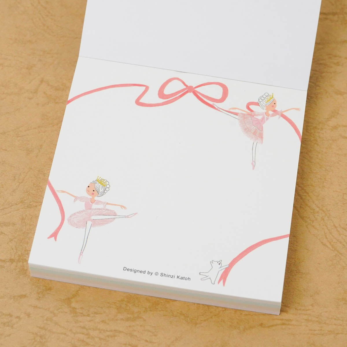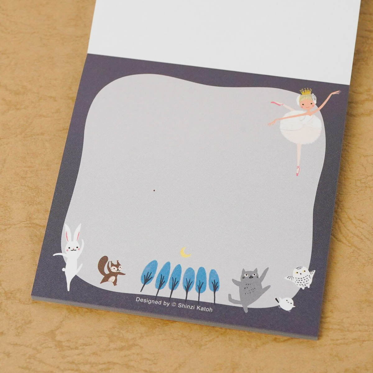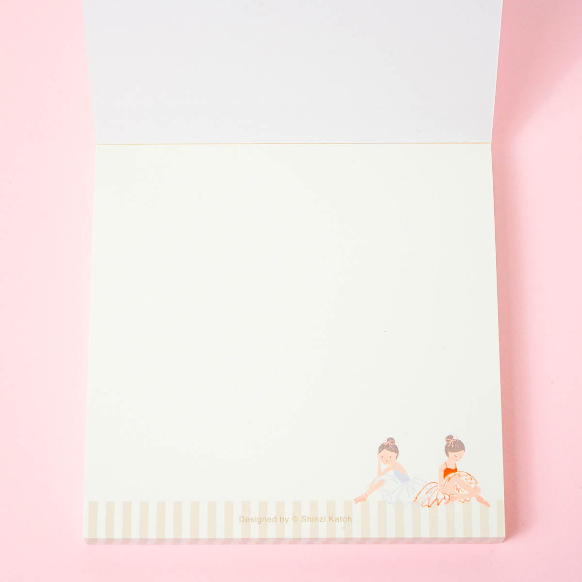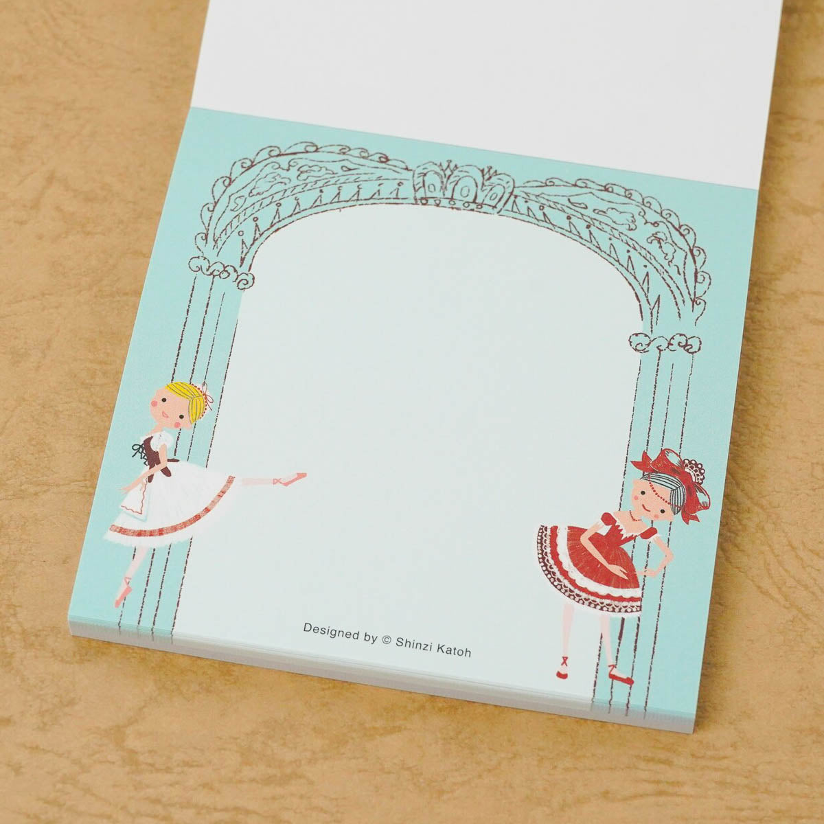 Der quadratische Notizblock zeigt von Shinzi Katoh gestaltete Illustrationen rund um das Thema Ballett, die jede Seite dezent am Rand schmücken. Die feinen Motive begleiten Alltagsnotizen wie Telefonnotizen oder Einkaufslisten. Er eignet sich sowohl für den täglichen Gebrauch als auch als kleine, liebevolle Geschenkbeigabe.
