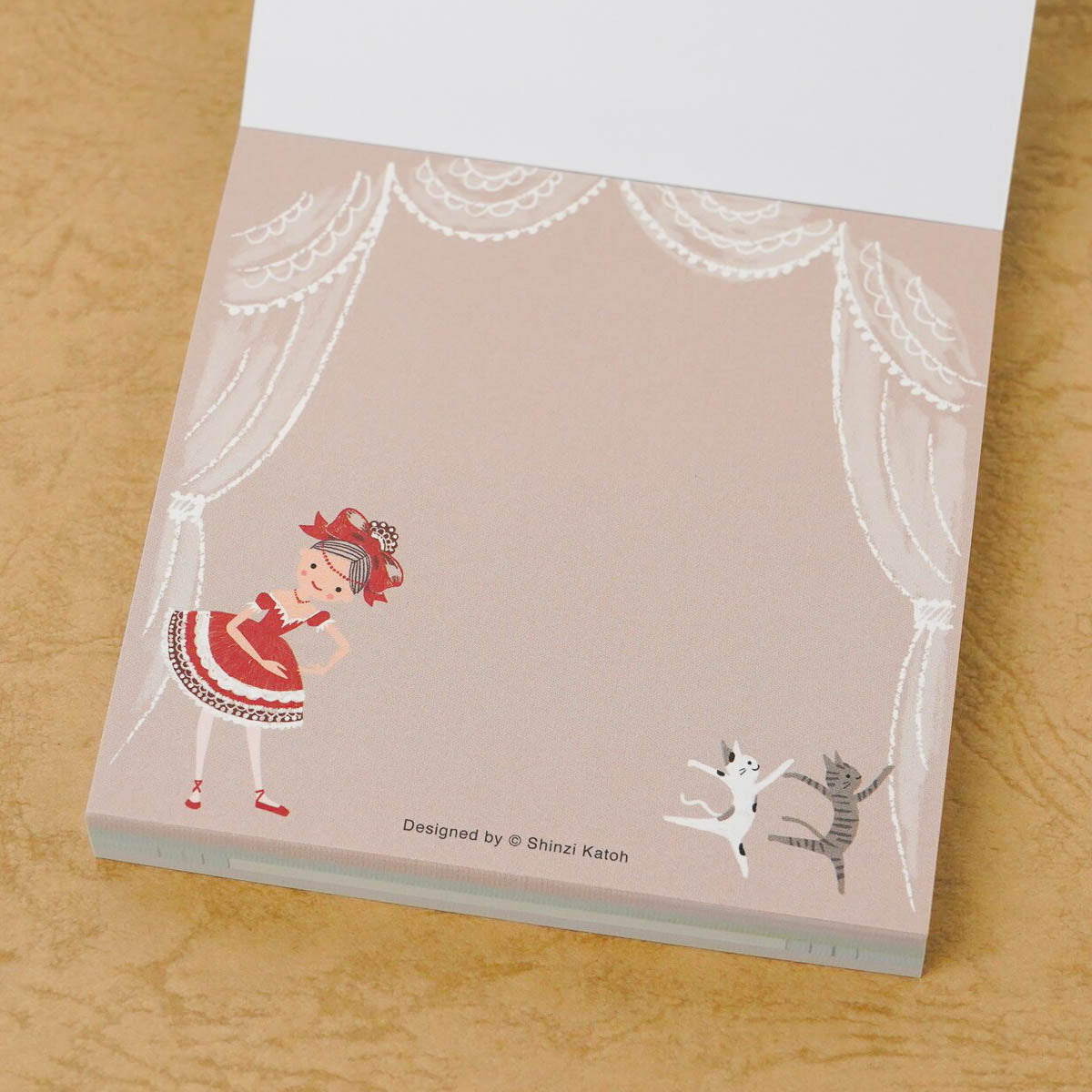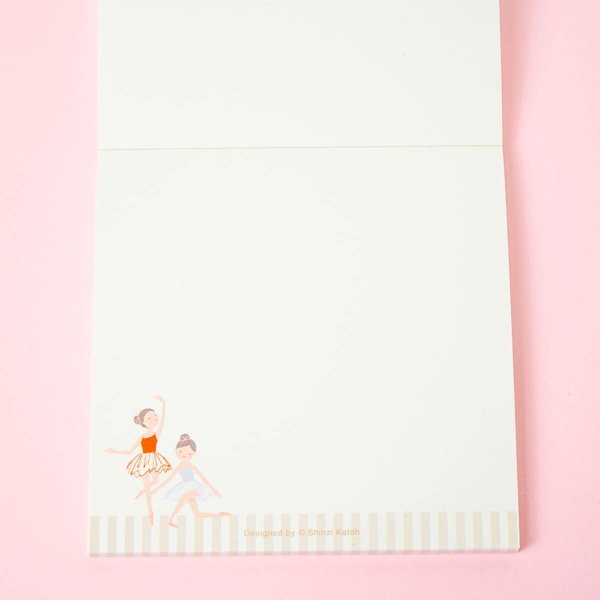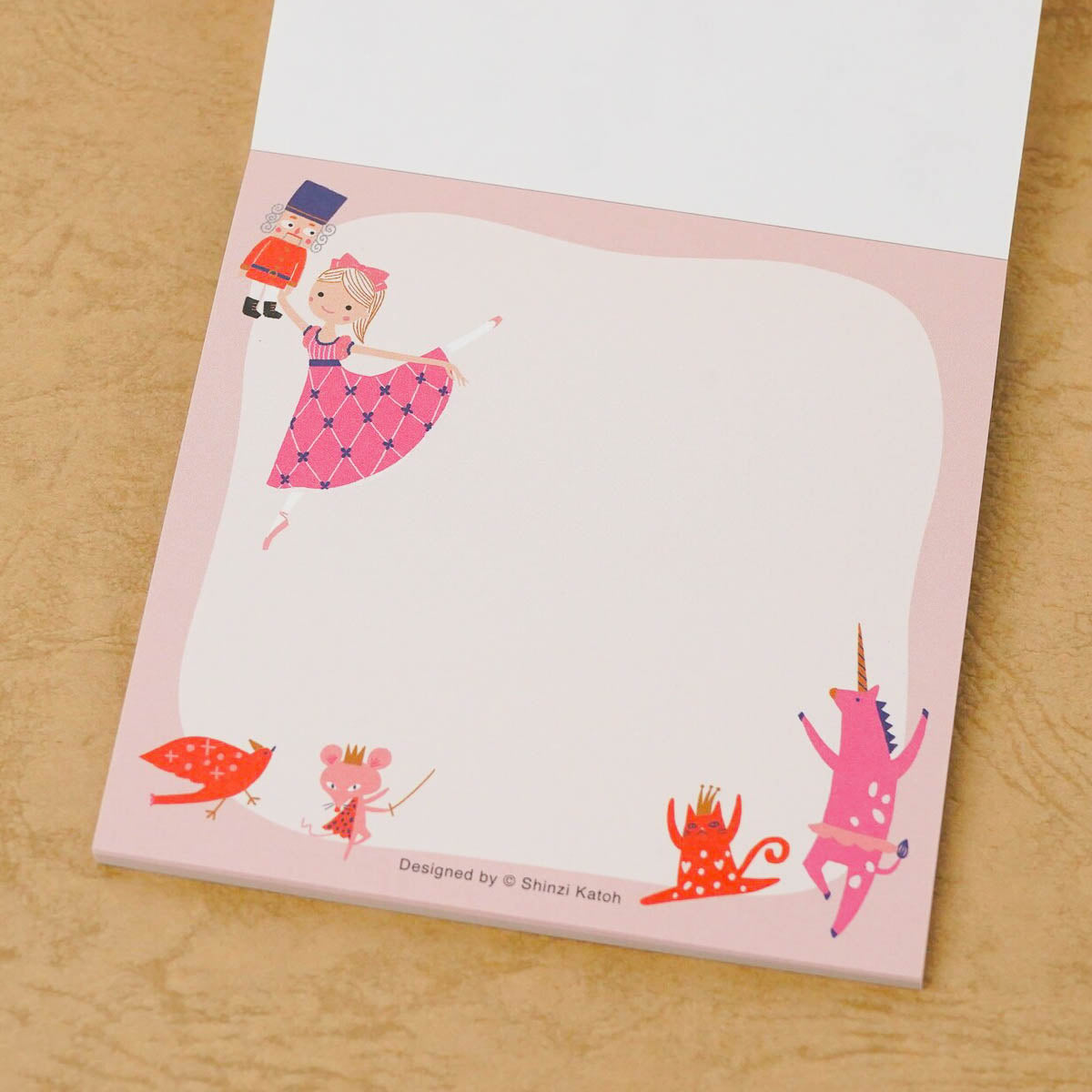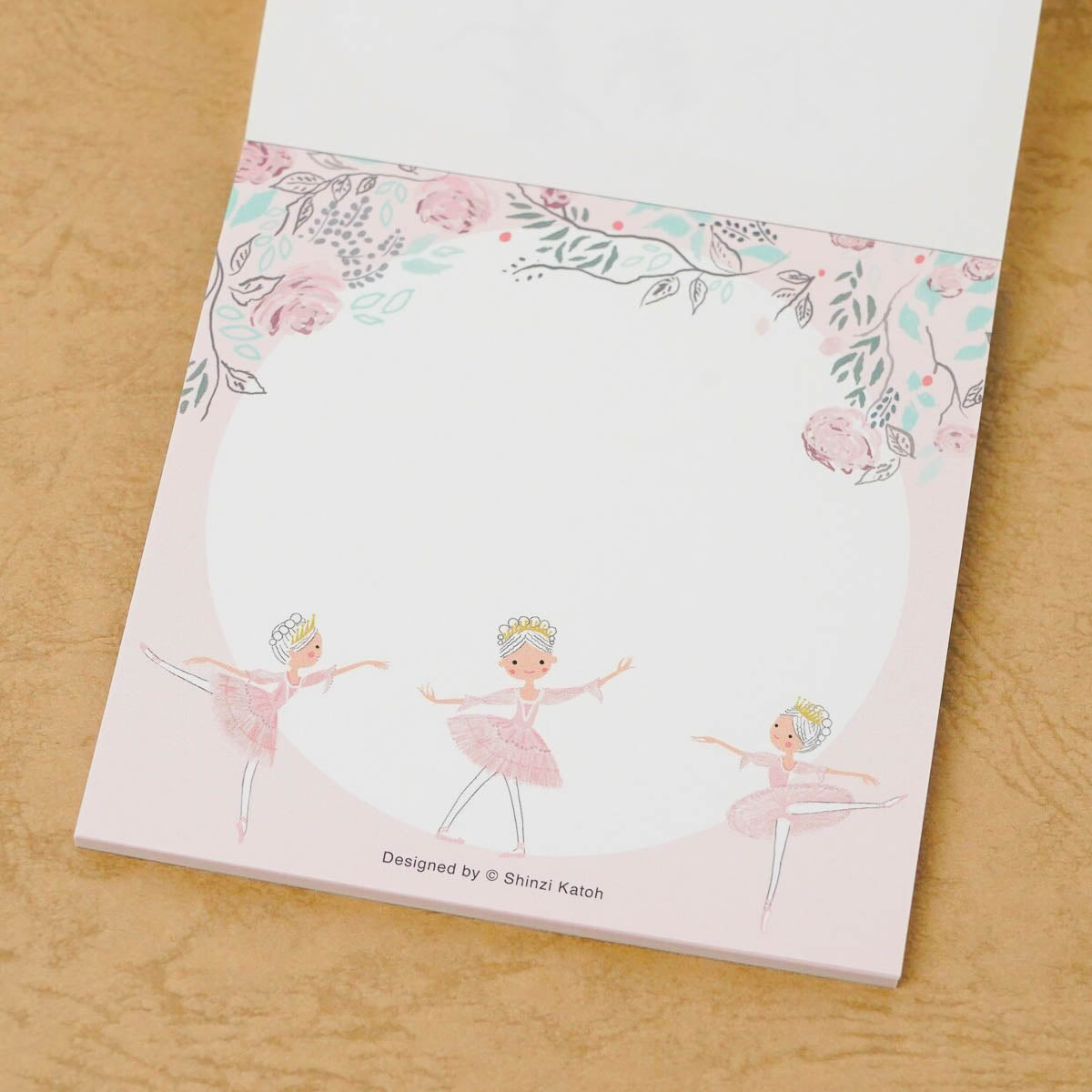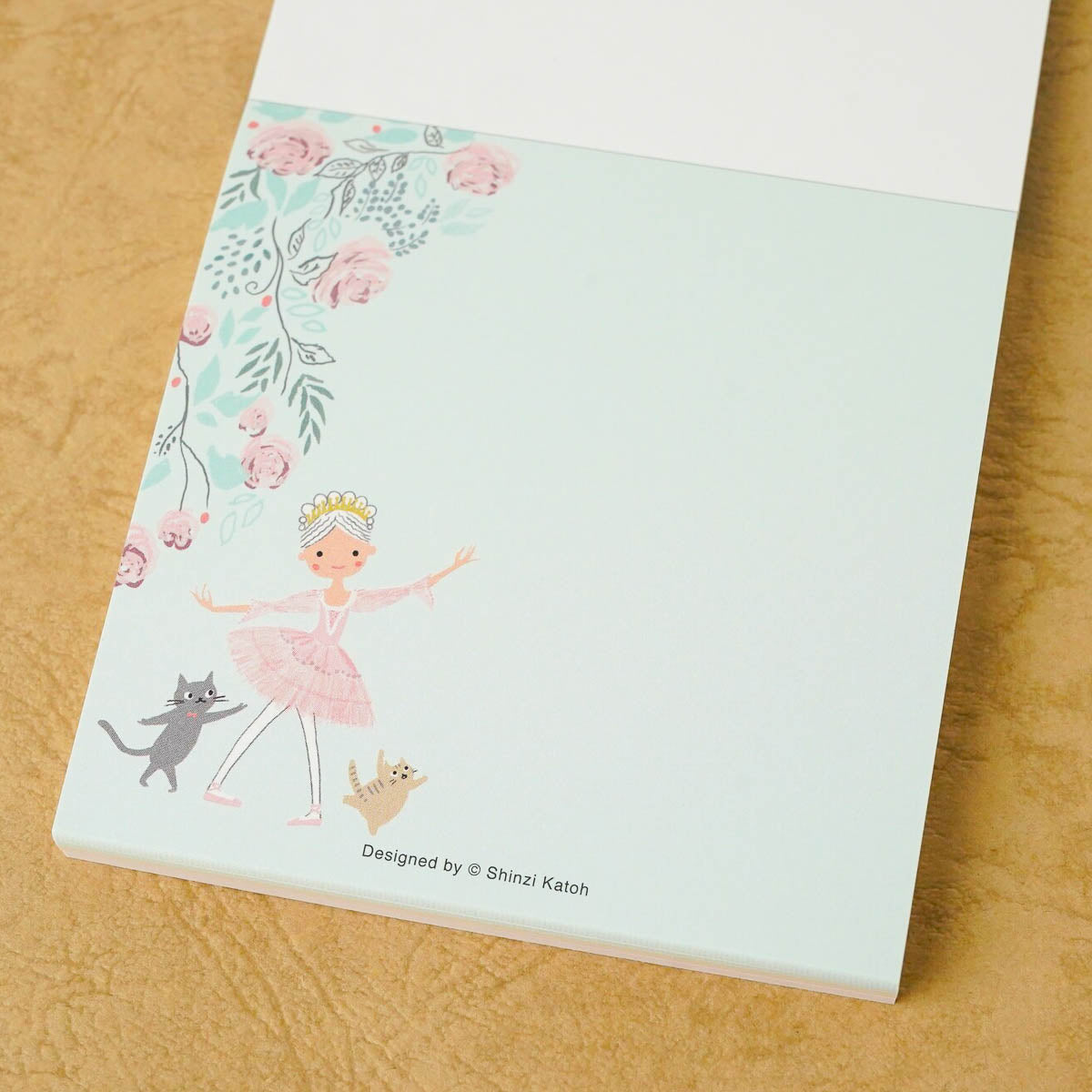 Der quadratische Notizblock zeigt von Shinzi Katoh gestaltete Illustrationen rund um das Thema Ballett, die jede Seite dezent am Rand schmücken. Die feinen Motive begleiten Alltagsnotizen wie Telefonnotizen oder Einkaufslisten. Er eignet sich sowohl für den täglichen Gebrauch als auch als kleine, liebevolle Geschenkbeigabe.