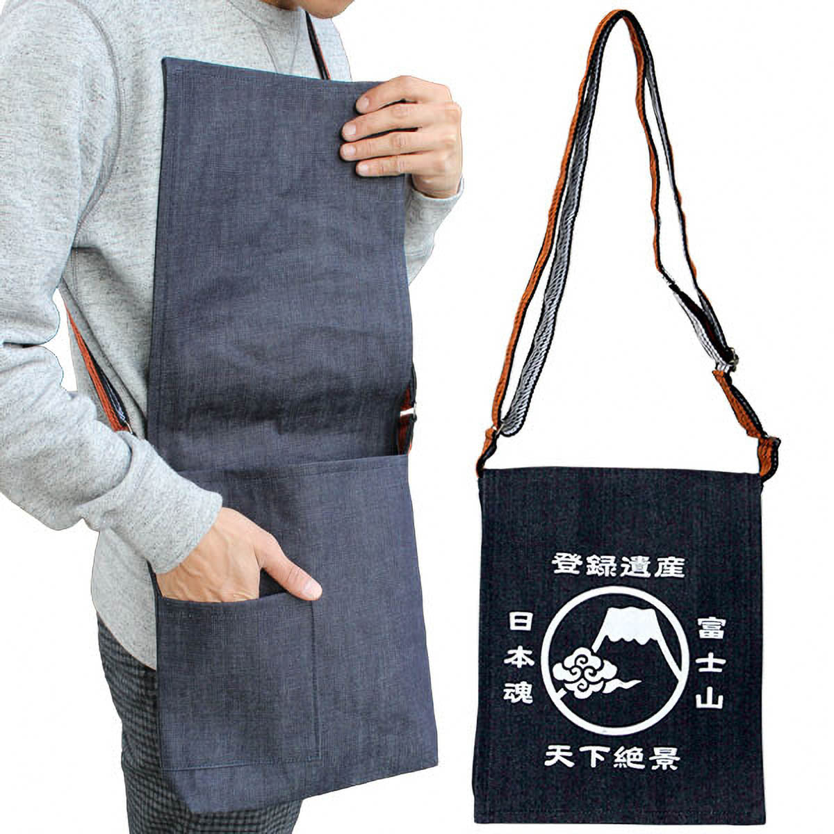 Eine robuste Schultertasche aus japanischem Denim, gestaltet mit traditionellen japanischen Schildern. Das strapazierfähige Material verändert sich mit der Nutzung auf natürliche Weise, wird weicher und erhält einen individuellen, lebendigen Look. Dank ihres großzügigen Formats bietet sie Platz für A4-Unterlagen oder ein Tablet und eignet sich damit ideal für Alltag und Reisen; eine zusätzliche Außentasche sorgt für praktischen Stauraum.