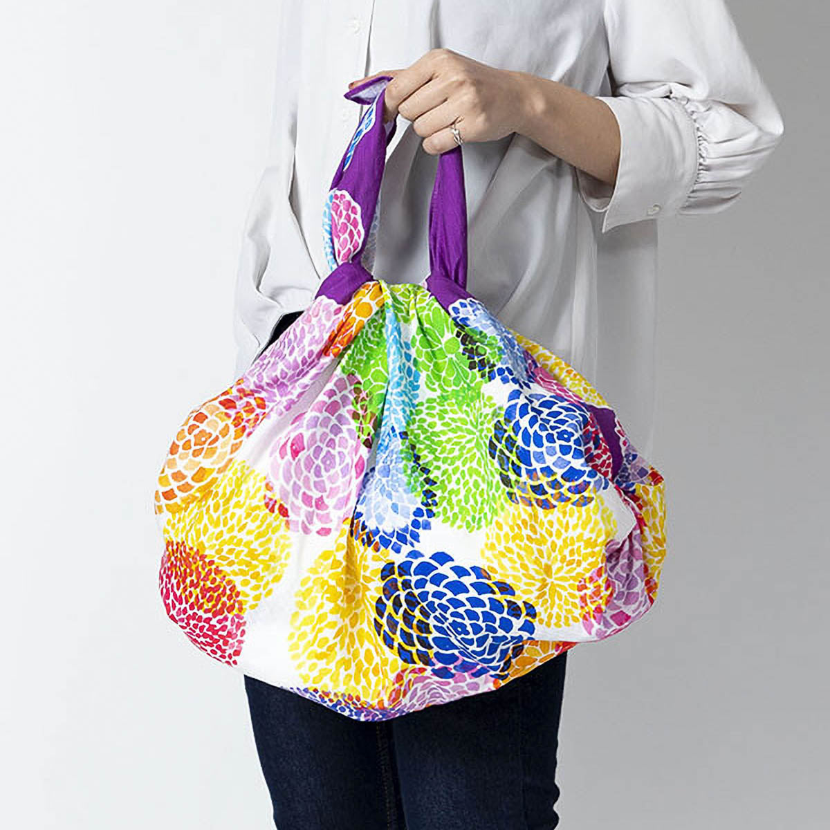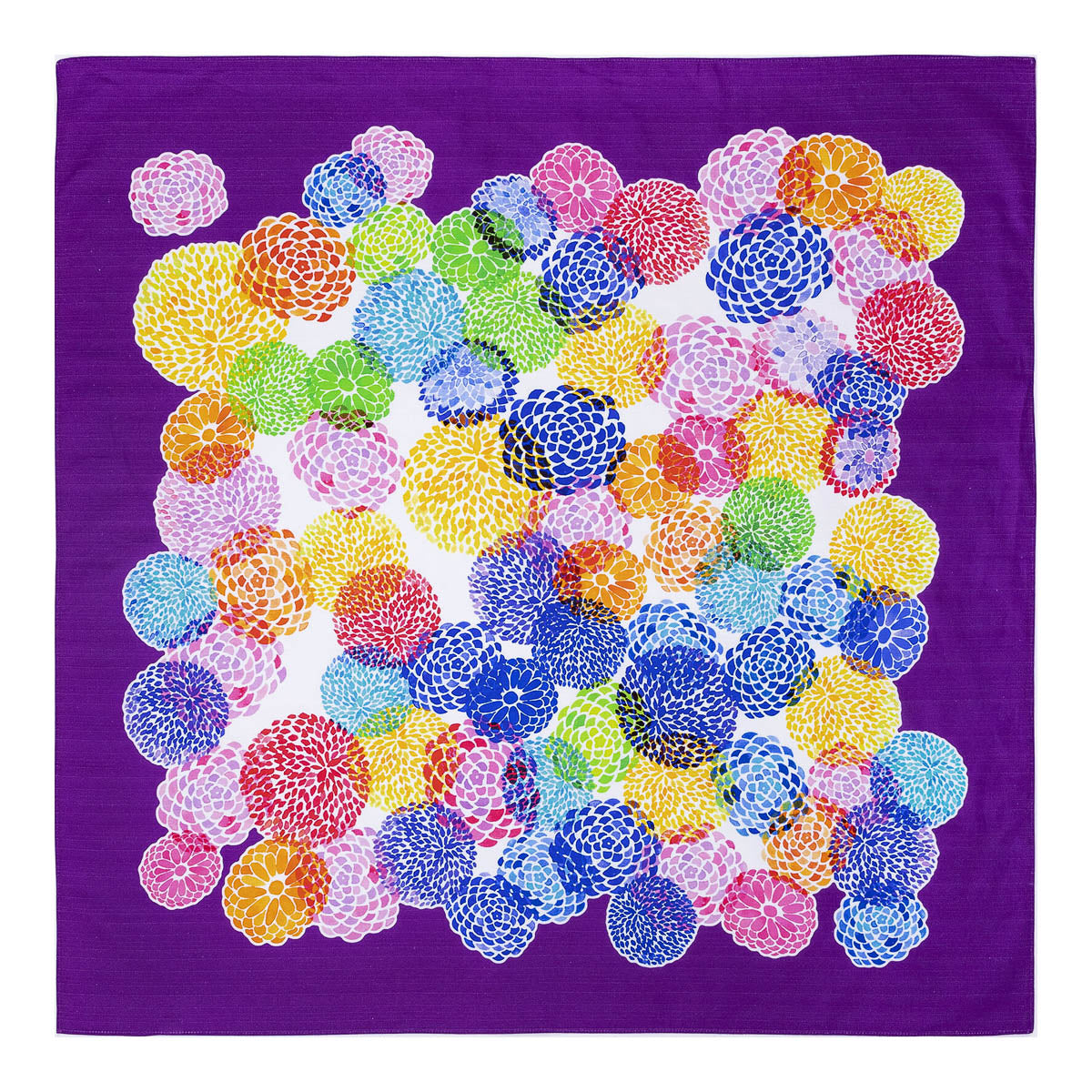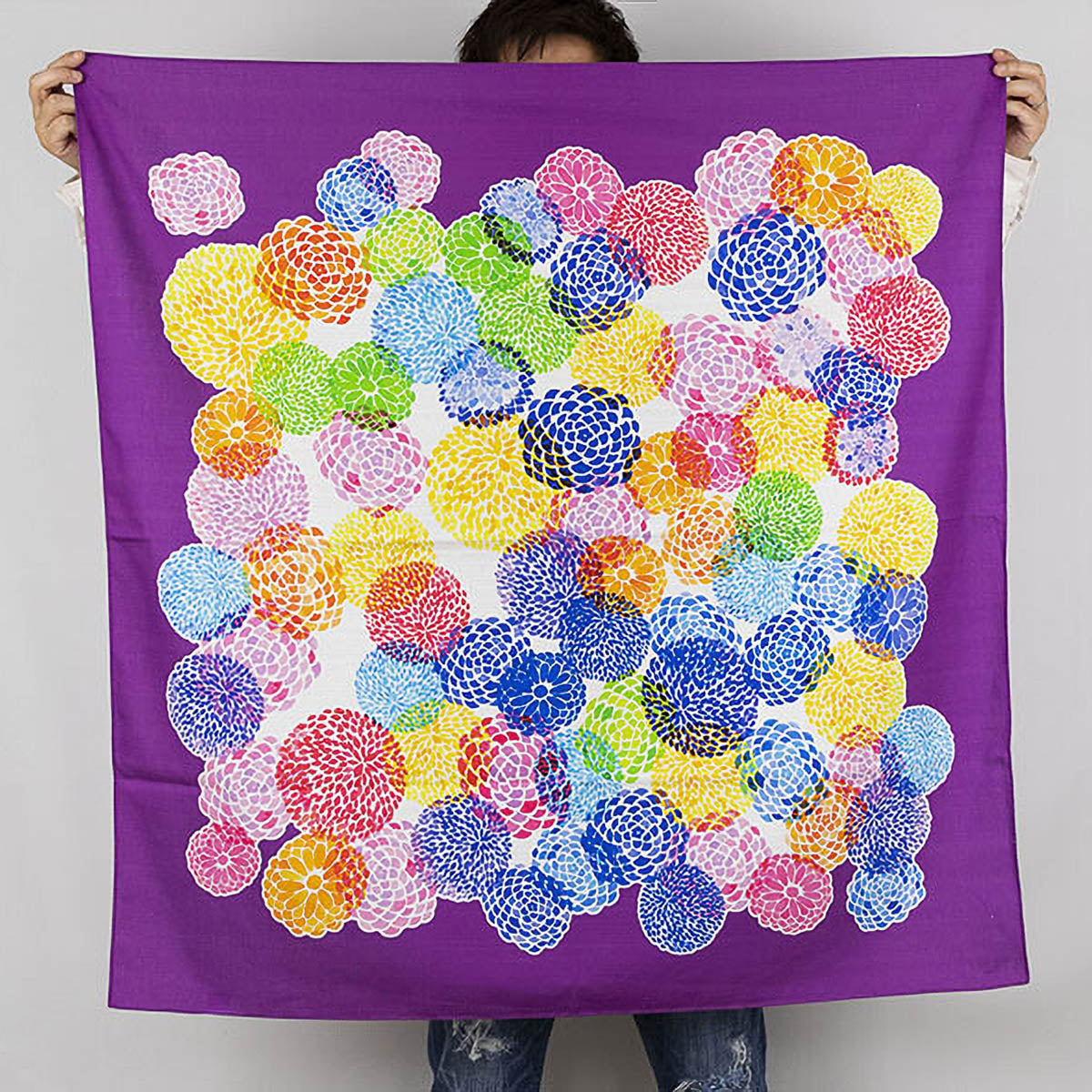 Furoshiki aus robustem Cotton Shantan, vielseitig einsetzbar als Eco-Bag, Tischdecke oder leichter Schal. Das Tuch zeigt ein lebendiges Muster aus farbenfrohen Chrysanthemen, deren überlagerte Farben für besondere Tiefe und Ausdruck sorgen. Hergestellt in Japan.