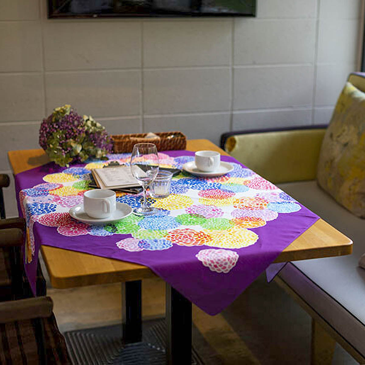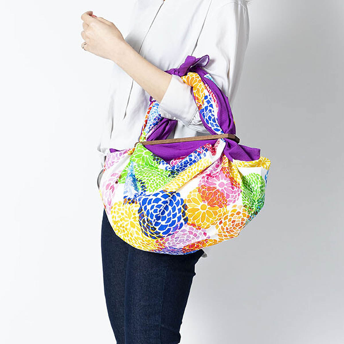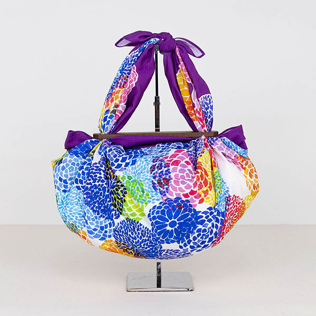 Furoshiki aus robustem Cotton Shantan, vielseitig einsetzbar als Eco-Bag, Tischdecke oder leichter Schal. Das Tuch zeigt ein lebendiges Muster aus farbenfrohen Chrysanthemen, deren überlagerte Farben für besondere Tiefe und Ausdruck sorgen. Hergestellt in Japan.