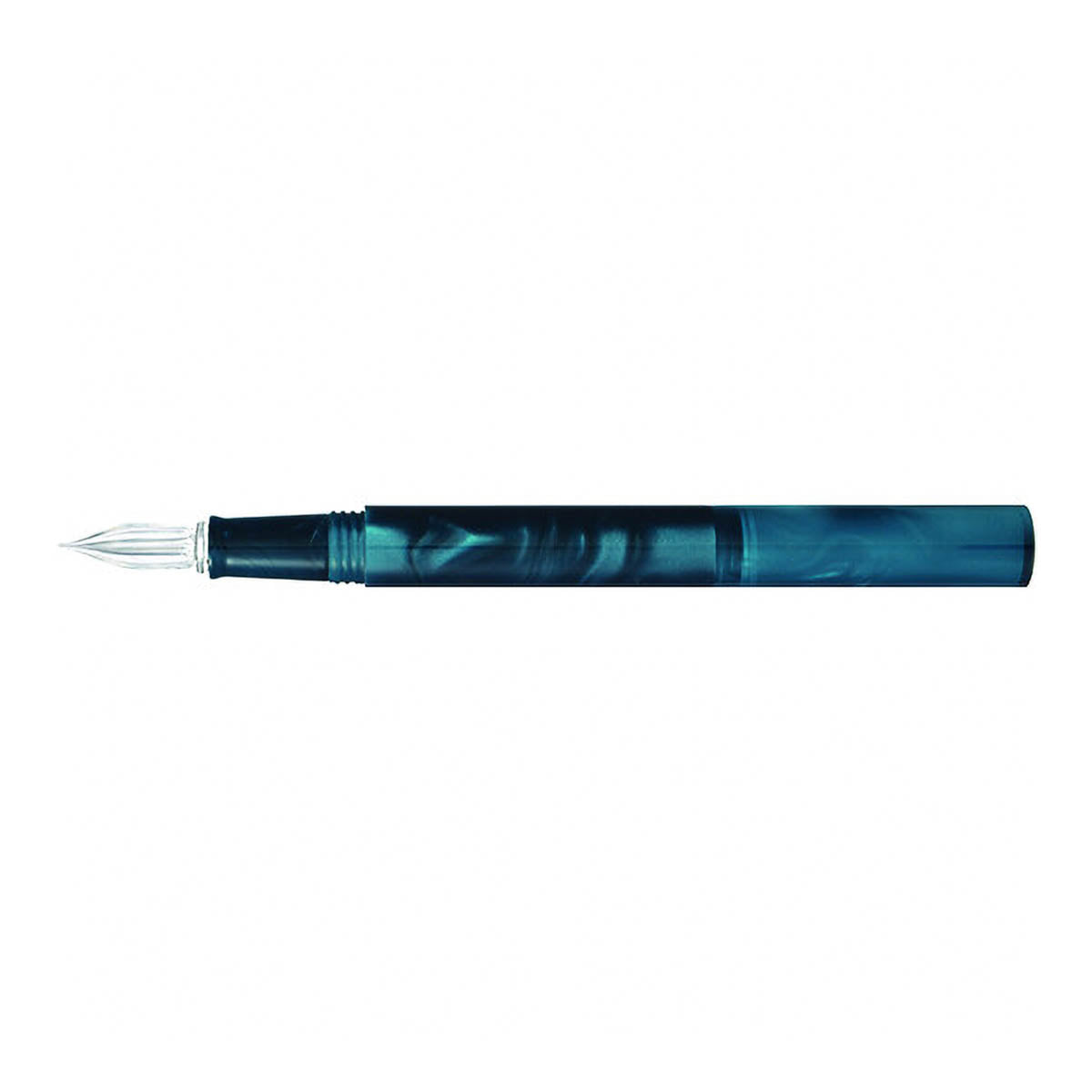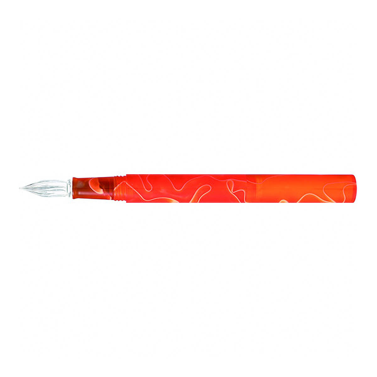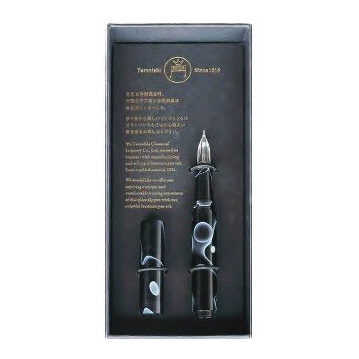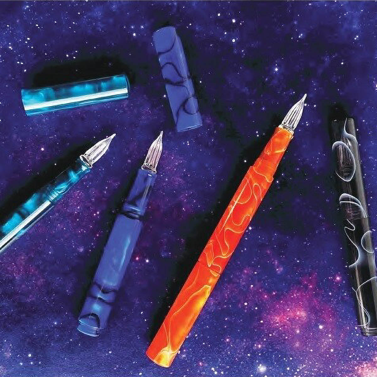 Der Glasstift zeigt eine schimmernde Farbgebung und fließende Muster, die an ein kosmisches Aurora-Spiel erinnern. Die schützende Kappe ermöglicht einen sicheren Transport und unterstreicht die alltagstaugliche Nutzung. Das Design verbindet eine geheimnisvolle Anmutung mit einer dezenten, reifen Farbpalette.