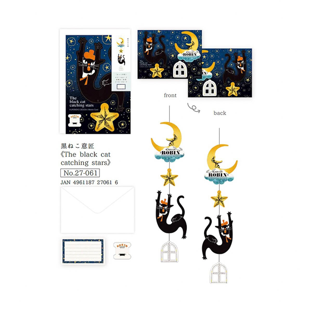 Die Motive dieser Grußkarte sind vorgestanzt, und durch die Löcher kann ein Faden gezogen werden, um ein Mobile zu basteln. Sie wird außerdem mit einer Nachrichtenkarte und einem Umschlag geliefert.
