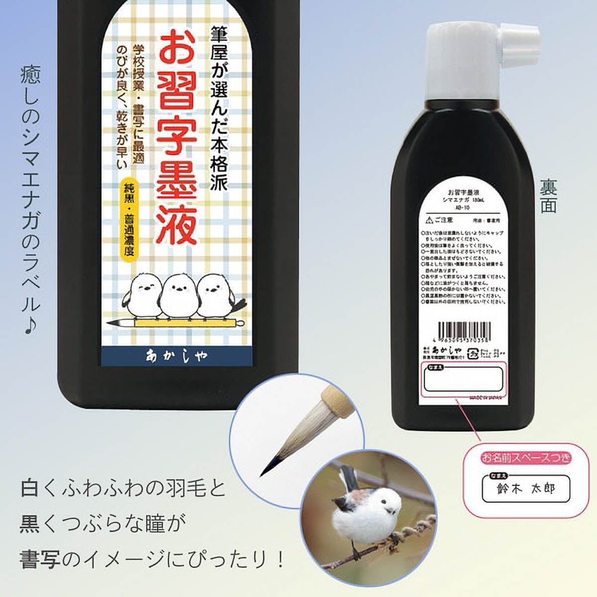 Die flüssige Tusche bietet eine reine schwarze Farbe in normaler Konzentration und eignet sich durch gutes Fließverhalten und schnelles Trocknen besonders für den Schulunterricht und das regelmäßige Üben. Das seitliche Ausgussdesign erleichtert die Handhabung, und auf dem Etikett befindet sich eine kleine Illustration der in Hokkaidō beheimateten Shimaenaga. Eine zuverlässige Wahl für Schreibanfängerinnen und -anfänger sowie für den Unterricht.