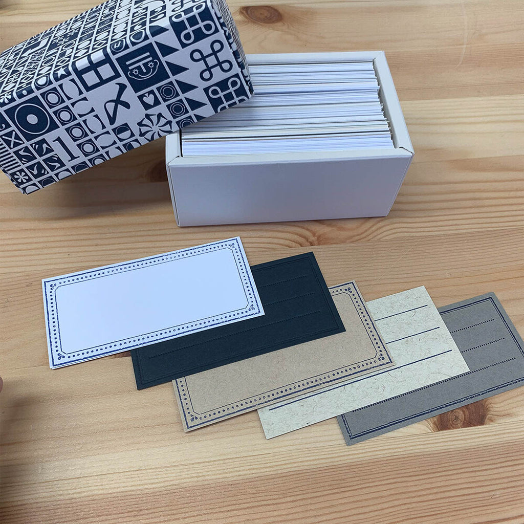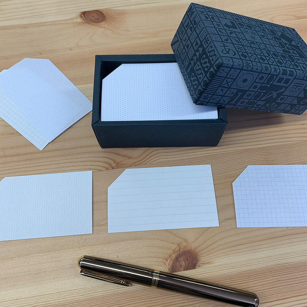 Gefertigt aus überschüssigem Offsetdruck-Papier, enthält das Set Notizblätter in drei Designs – Punkte, Linien und Gitter – sowie dicke Karten mit edlem Prägedruck. Die leichten Notizblätter haben eine abgeschrägte Ecke, die das Entnehmen erleichtert. Die stabile Box eignet sich nach dem Gebrauch ideal zur Aufbewahrung, zum Beispiel als Visitenkartenbox.