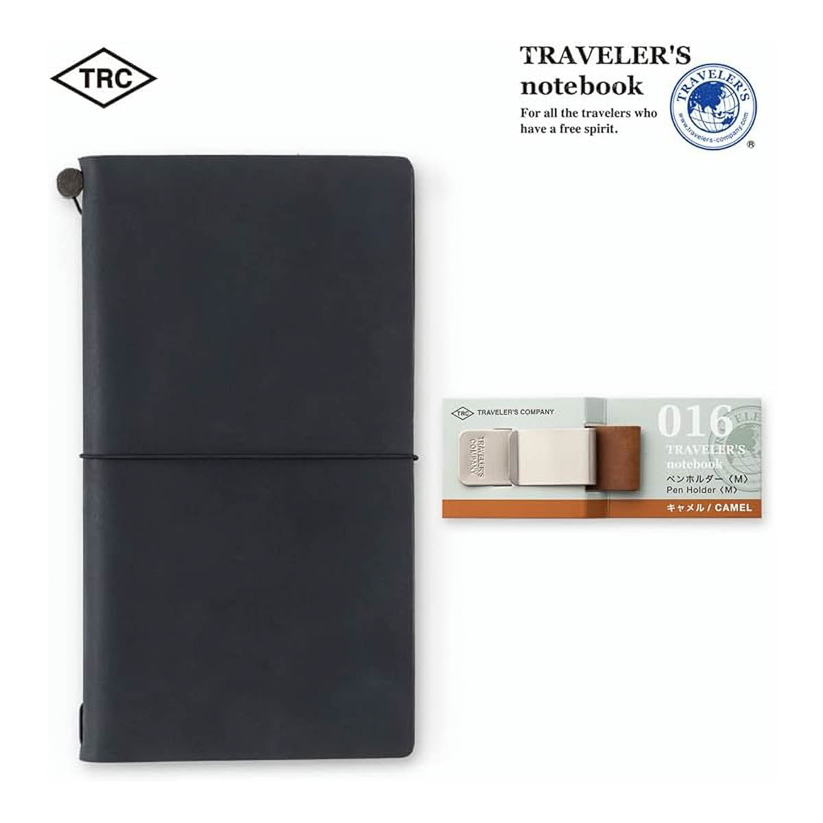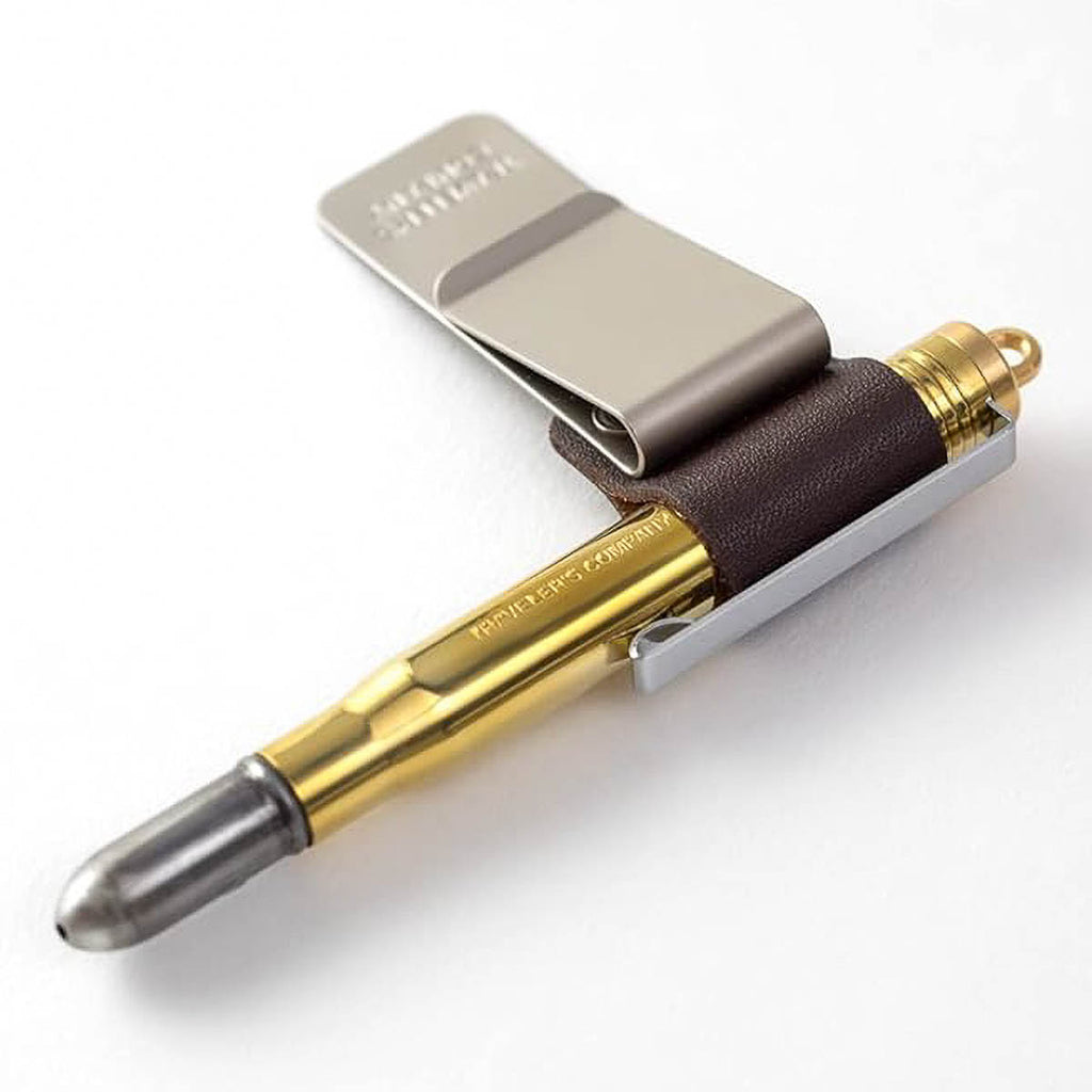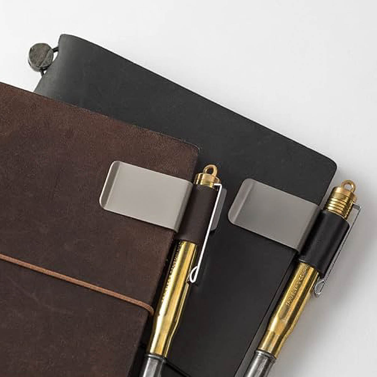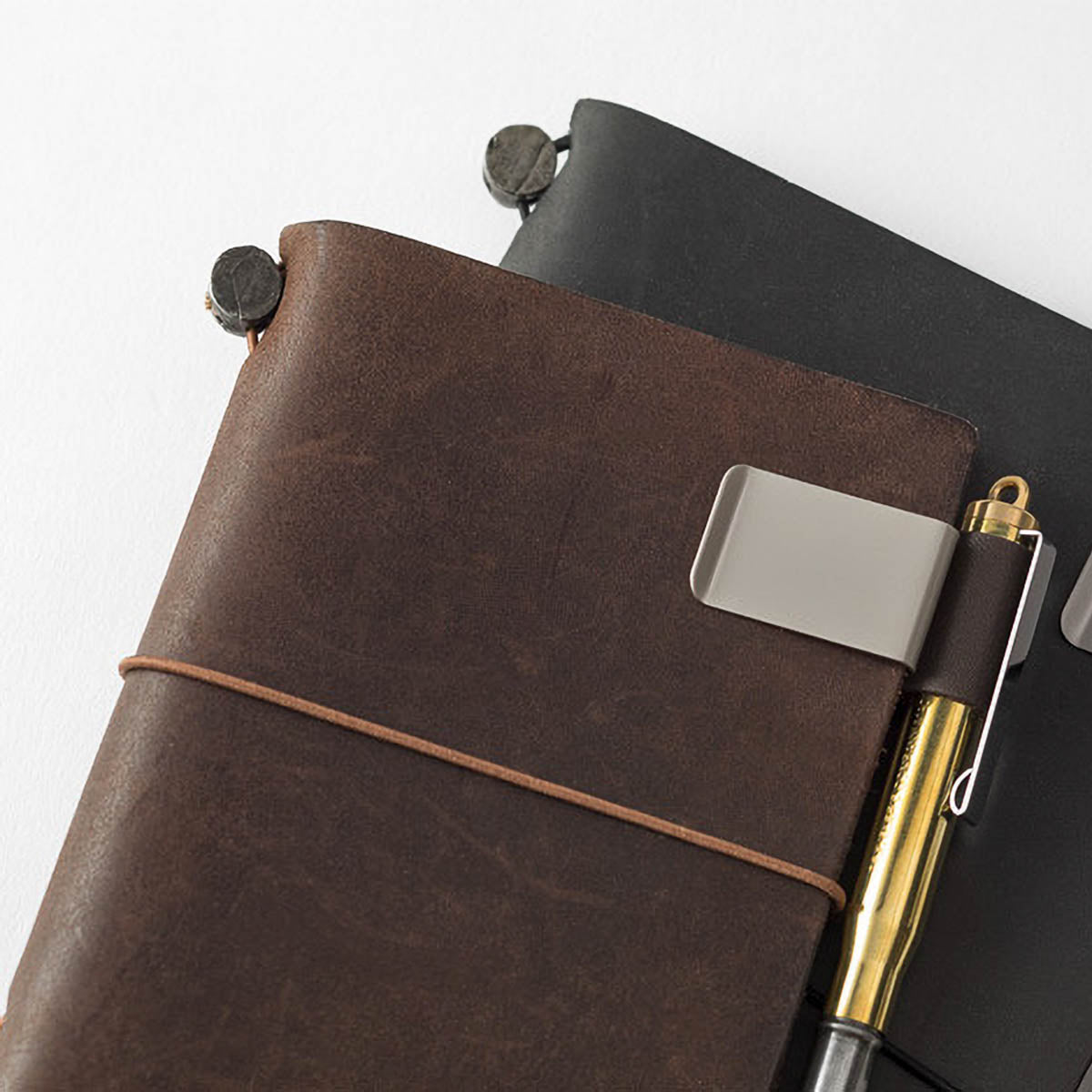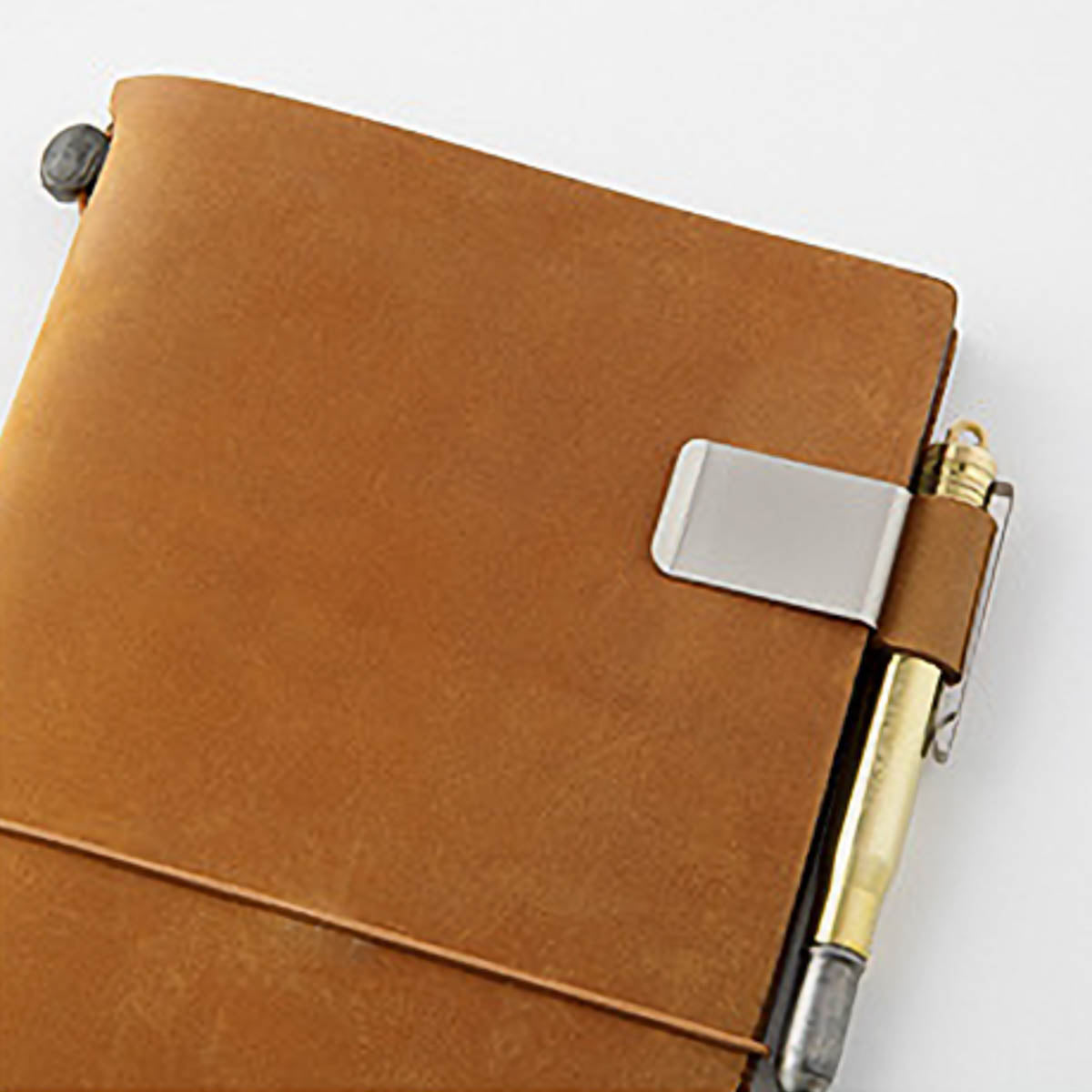 Der Stifthalter in Größe M lässt sich sowohl mit dem Passport- als auch mit dem Regular-Format des TRAVELER’S Notebook verwenden. Er fasst Schreibgeräte bis zu einem Durchmesser von etwa 12 mm und ergänzt das Notizbuch um eine einfache, praktische Befestigungsmöglichkeit. Eine kompakte Lösung, um den bevorzugten Stift stets griffbereit zu haben.