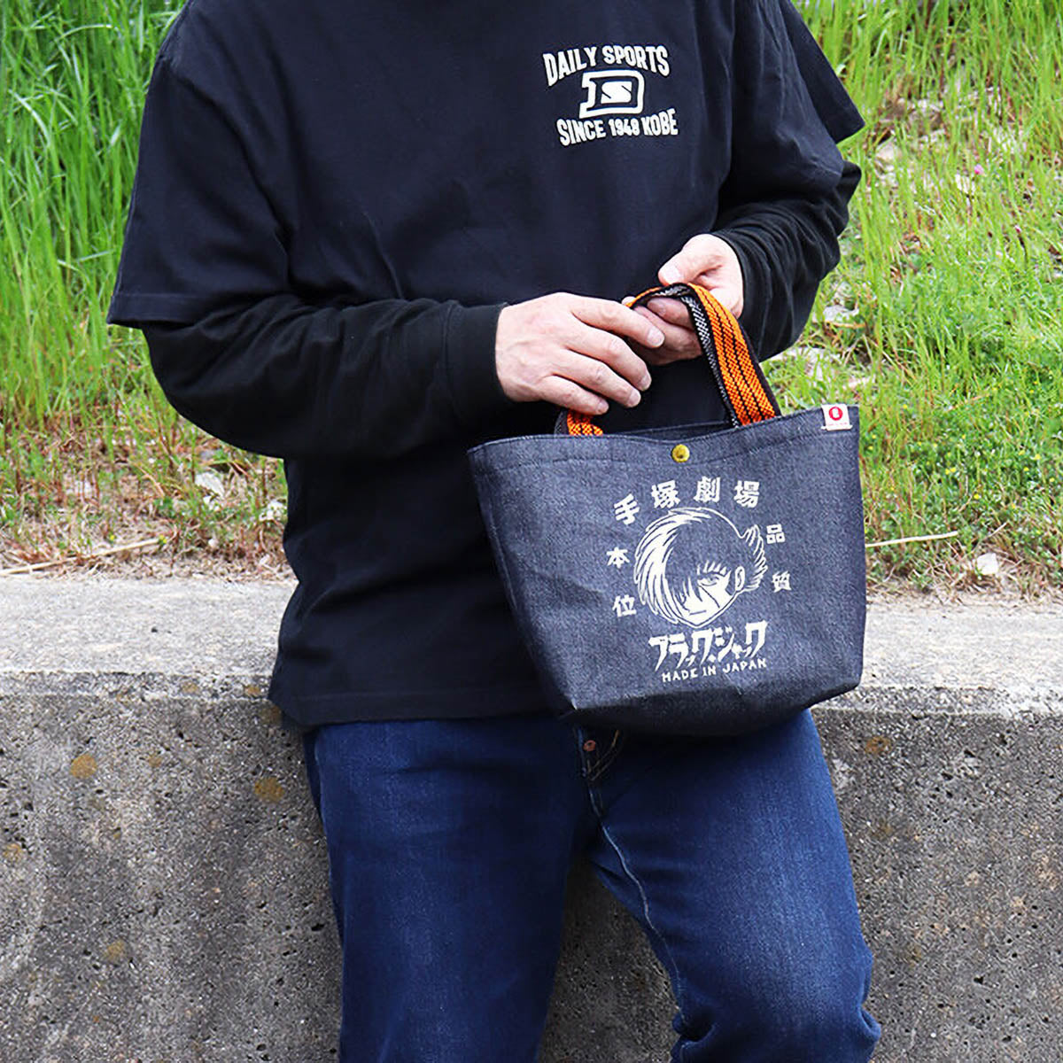 Die kompakte Denim-Tragetasche zeigt charakteristische Motive aus Osamu Tezukas „Black Jack“ und wird in Osaka handgefertigt. Hergestellt aus robustem japanischem Denim und mit orangen Griffen versehen, kombiniert sie nostalgisches Design mit langlebiger Verarbeitung. Eine praktische Innentasche und die typische Patina-Entwicklung des Rigid-Denims machen sie zu einem vielseitigen Alltagsbegleiter.